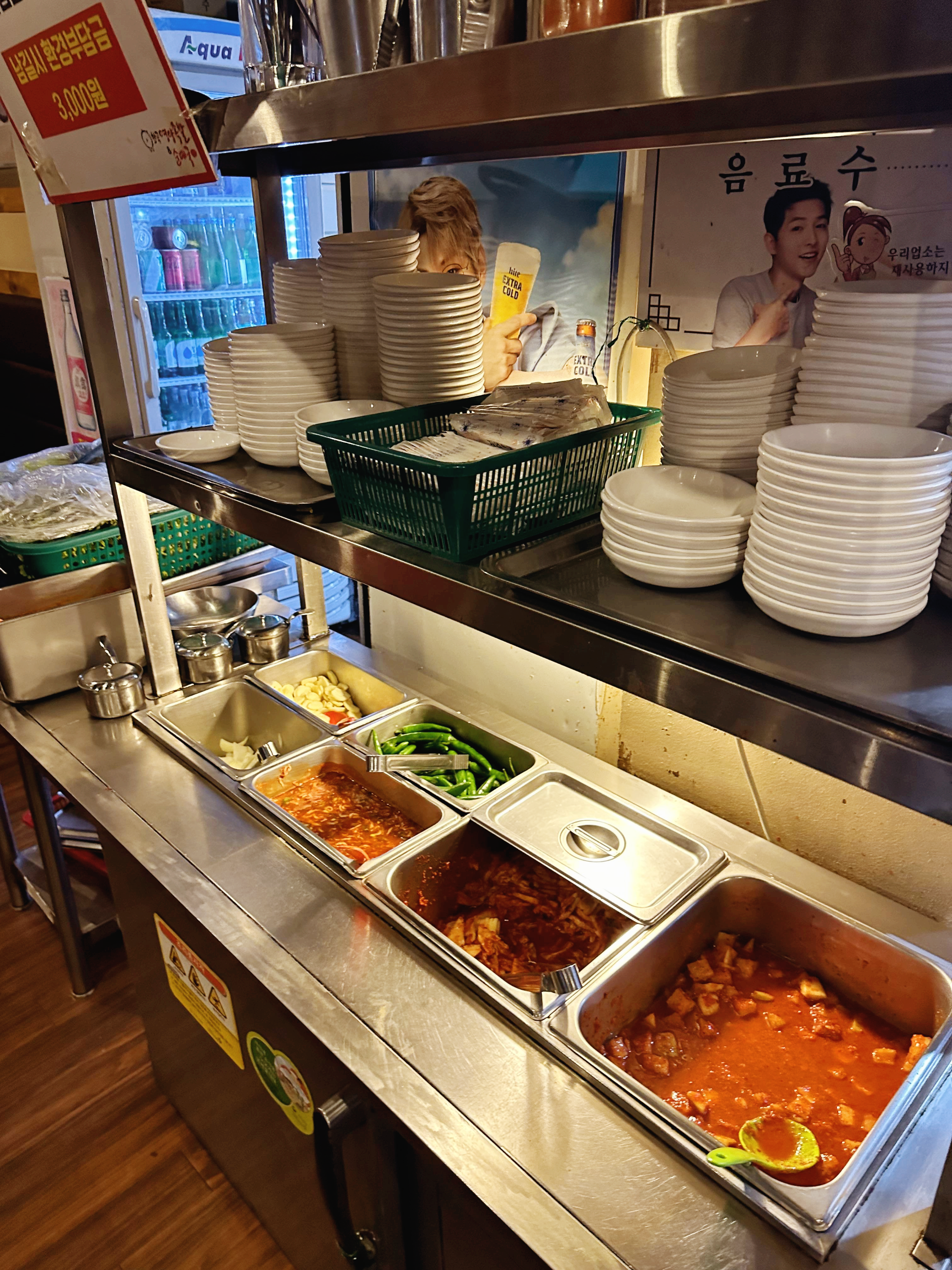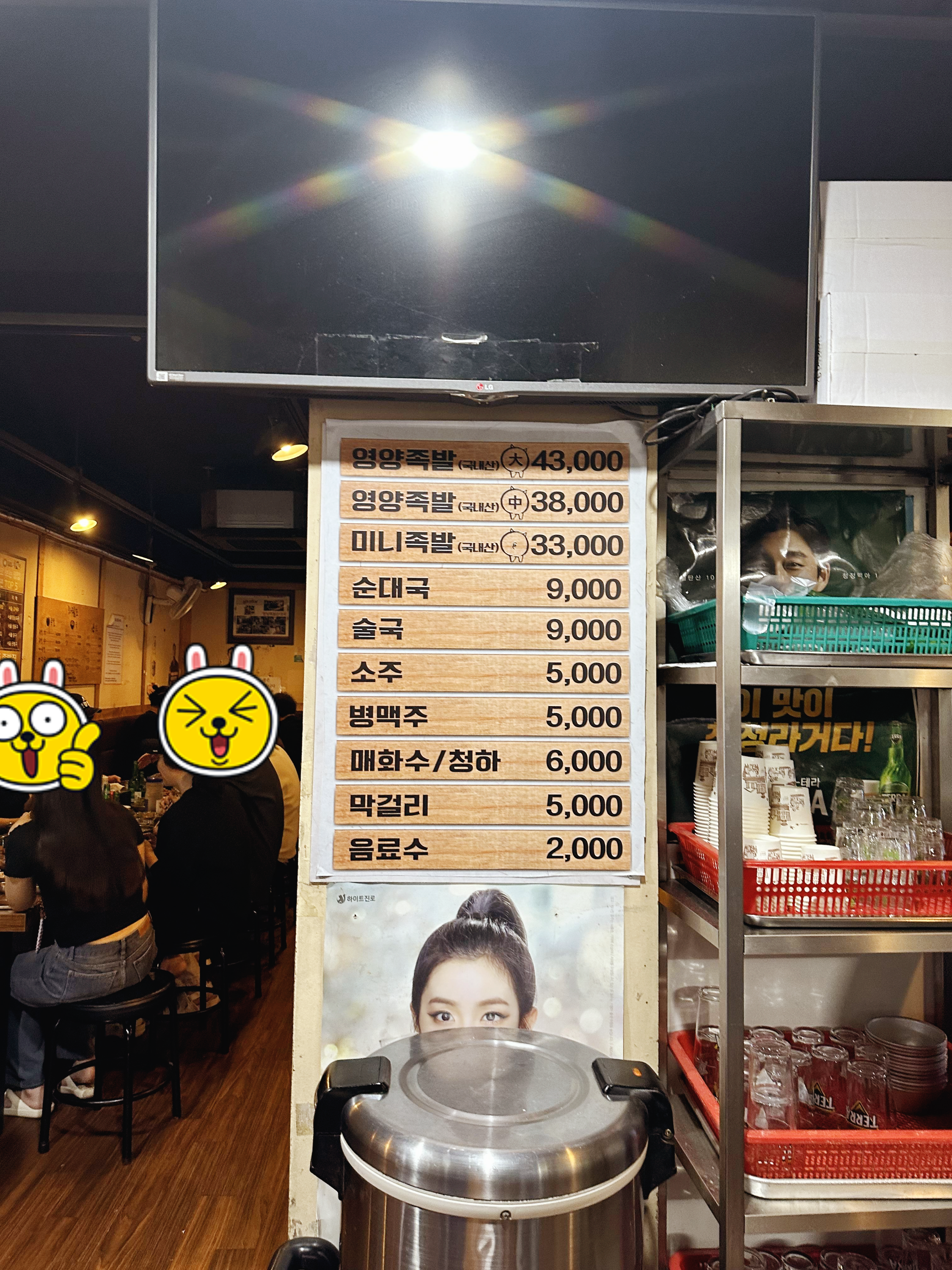 또한 순댓국 리필도 되는 것 같긴 한데... 한 번도 안 해봤다. ㅋㅋ 족발의 양이 너무 많기 때문에 먹다가 지쳐서 순댓국을 리필할 정도의 배가 남아 있지 않기 때문이다. (그리고 술 많이 시키면 순댓국 리필 거의 되는 듯하다. ㅋㅋ) 반찬들은 매장 중앙에 있는 리필 장소에 가면 있는데 처음에는 주지 않는 배추김치도 있으니 원한다면 먹어도 좋다. 참고로 깍두기는 잘 익었지만 배추김치는 상대적으로 덜 익었기 때문에 조금 괴리가 있긴 하다.