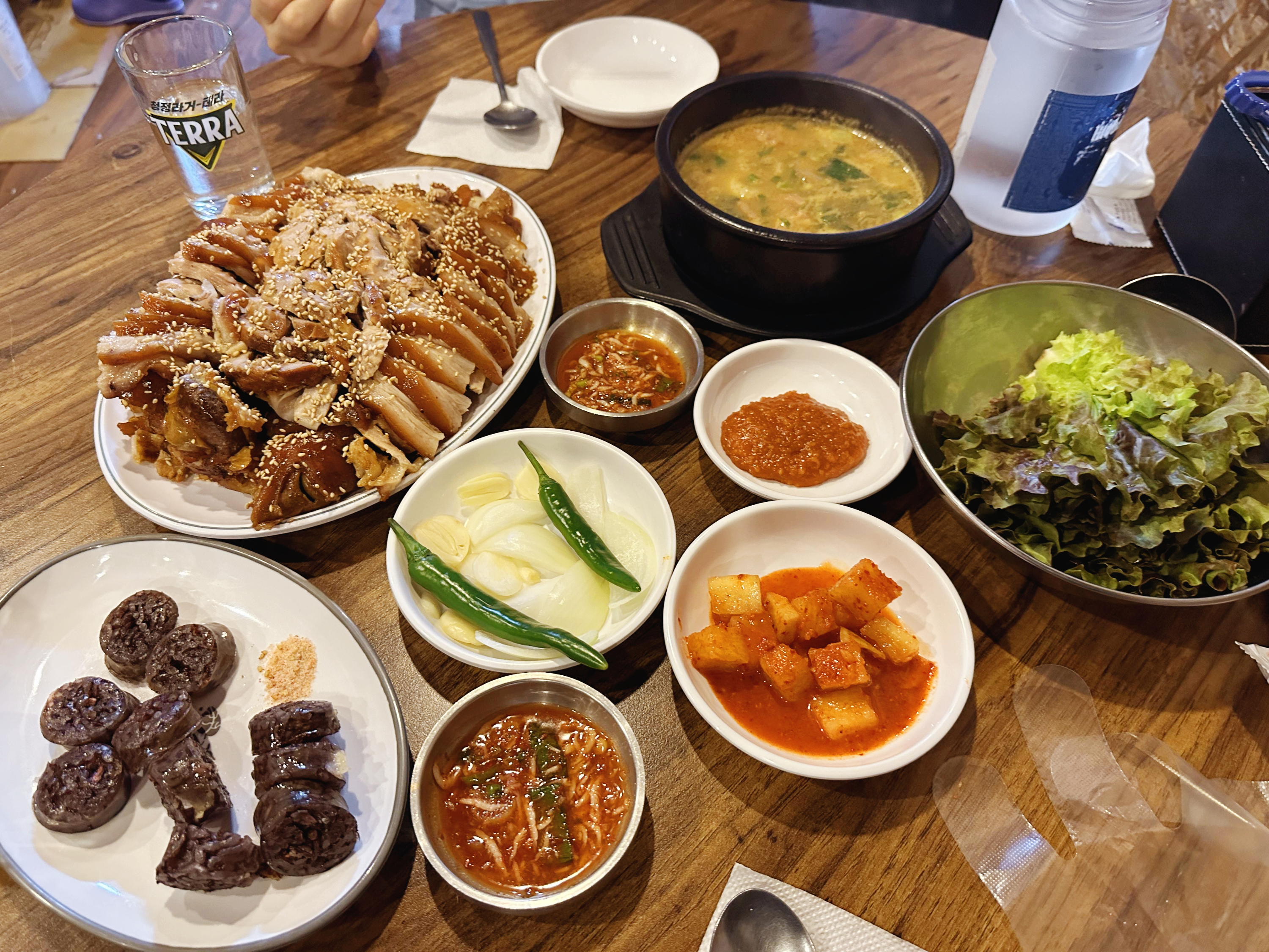 주문을 하고 나면 정말 거짓말하지 않고 5분이 되지 않아 족발이 나오는데... 이게 조금 복불복이다. 왜냐하면 가끔 족발은 나왔는데 아직 밑반찬이 세팅이 안 되어 있을 수도 있기 때문이다. 기본적으로 순대, 순댓국, 깍두기, 쌈채소와 새우젓이 나오는데 순댓국과 순대를 까먹고 안주는 경우가 있기 때문에 달라고 하면 준다.