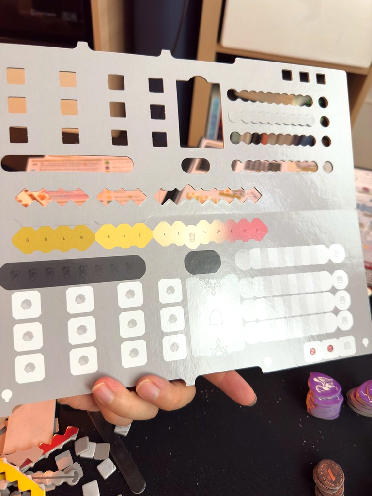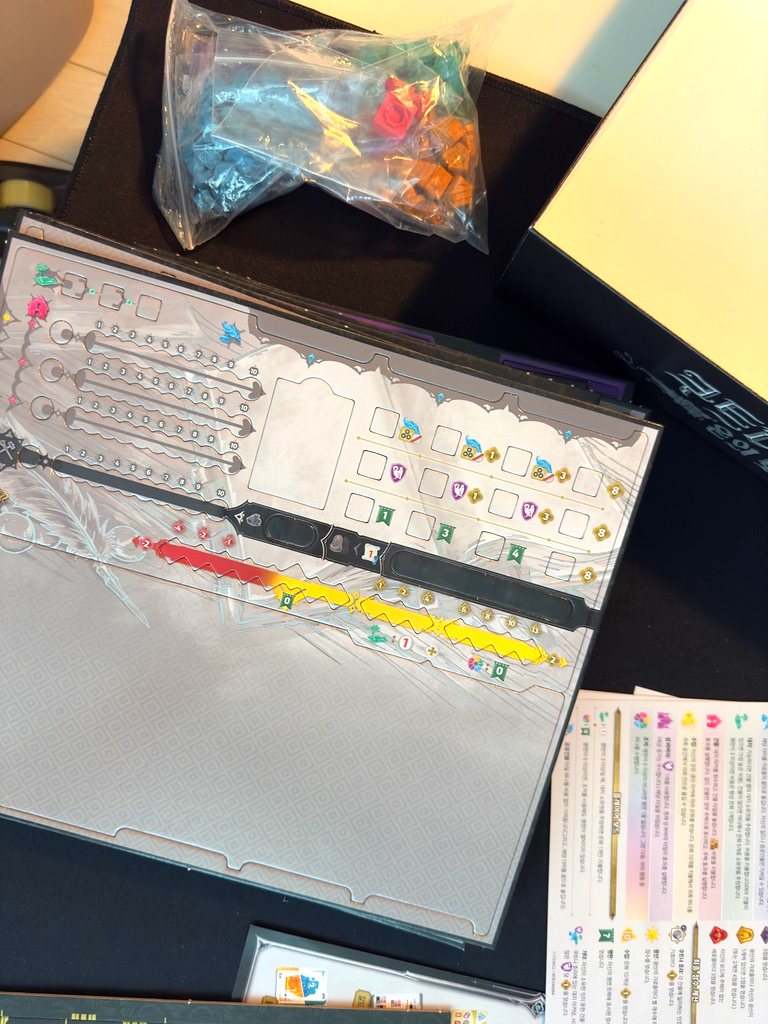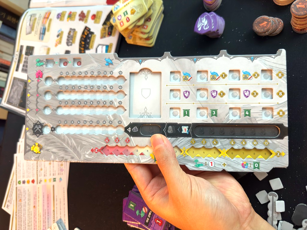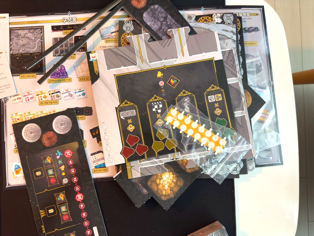 막상 상자를 까보니 생각보다 컴포나 구성품이 많아서 놀랐다. 엄청나게 많은 것은 아니지만 그래도 이 정도 미들급 보드게임 중에는 컴포양이 적지 않다. 거기에 보드도 개인 보드판과 중앙 공용 보드판, 거기에 조립을 해야 하는 판들도 있어서 펀칭양이 생각보다 많았다. 한 30분이면 다 하지 않을까 했는데... 거의 1시간 정도 걸린 것 같다.