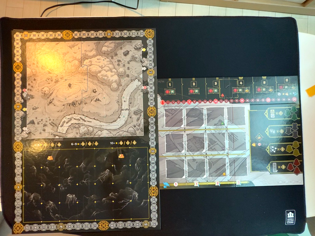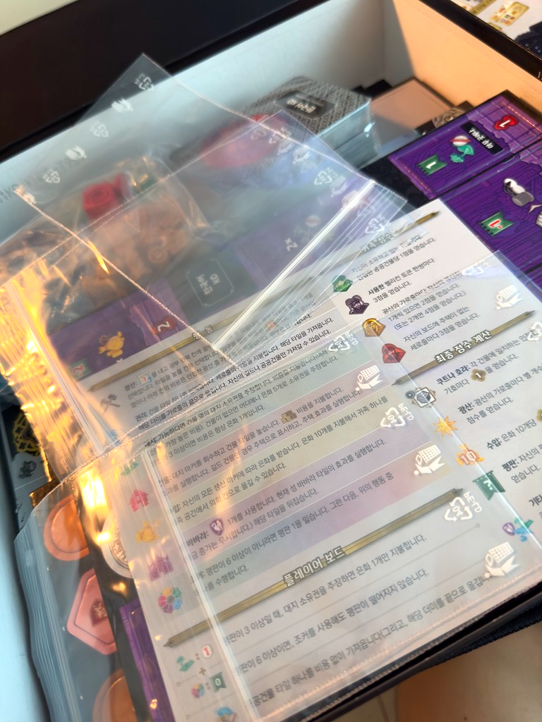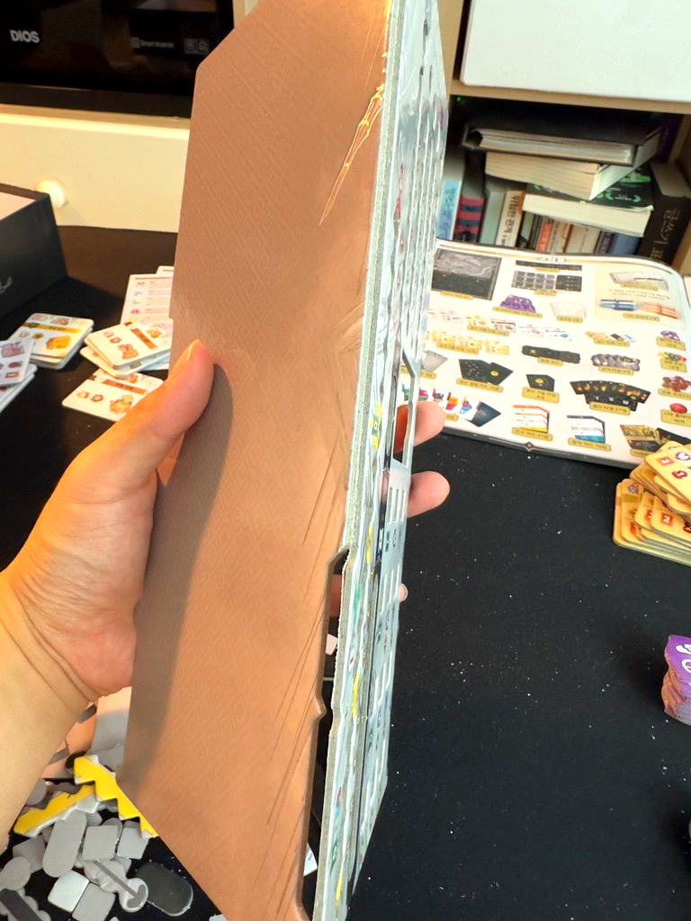 그래도 생각보다는 정리가 잘 되었는데 컴포와 보드가 많아서 잘 안 닫힐 줄 알았지만 요리조리 배치하니 유격도 없이 상자의 뚜껑이 잘 닫혔다. 게다가 확실히 미들급의 상자이다 보니 크지도 작지도 않아서 책장에 넣기도 원활해서 좋았다. 몇몇 리뷰를 읽어보니 3명 플레이와 4명 플레이의 느낌이 전혀 다르다고 하는데 아내와 한번 해 보고 친구들을 불러 한번 플레이해보고 싶다.