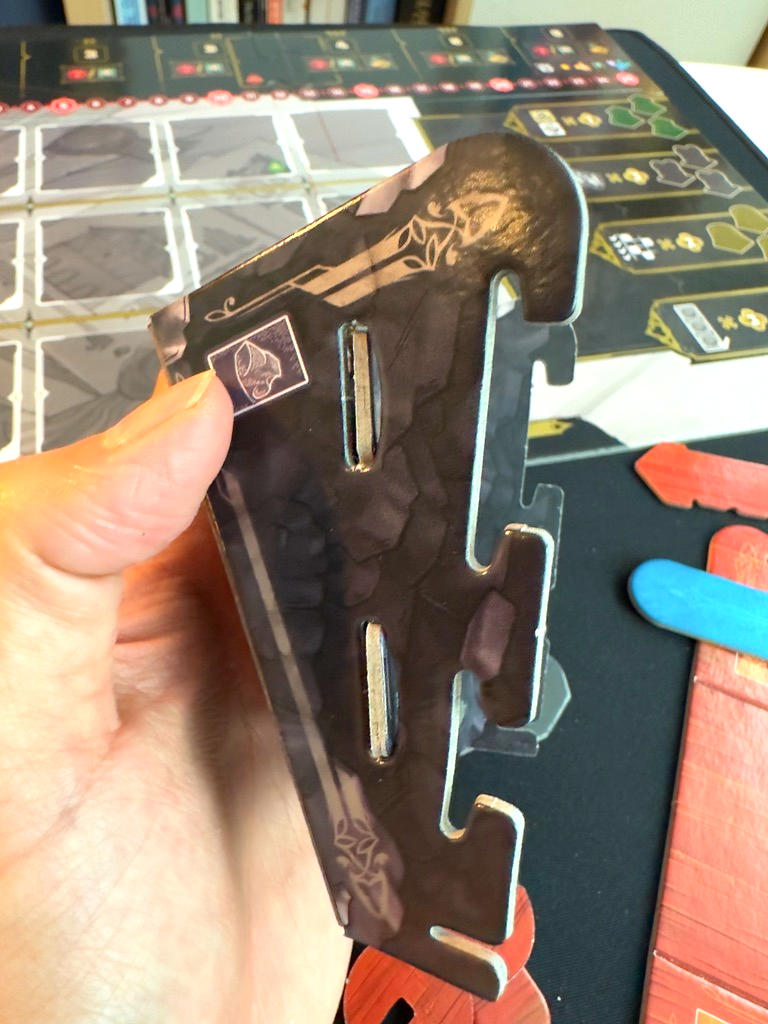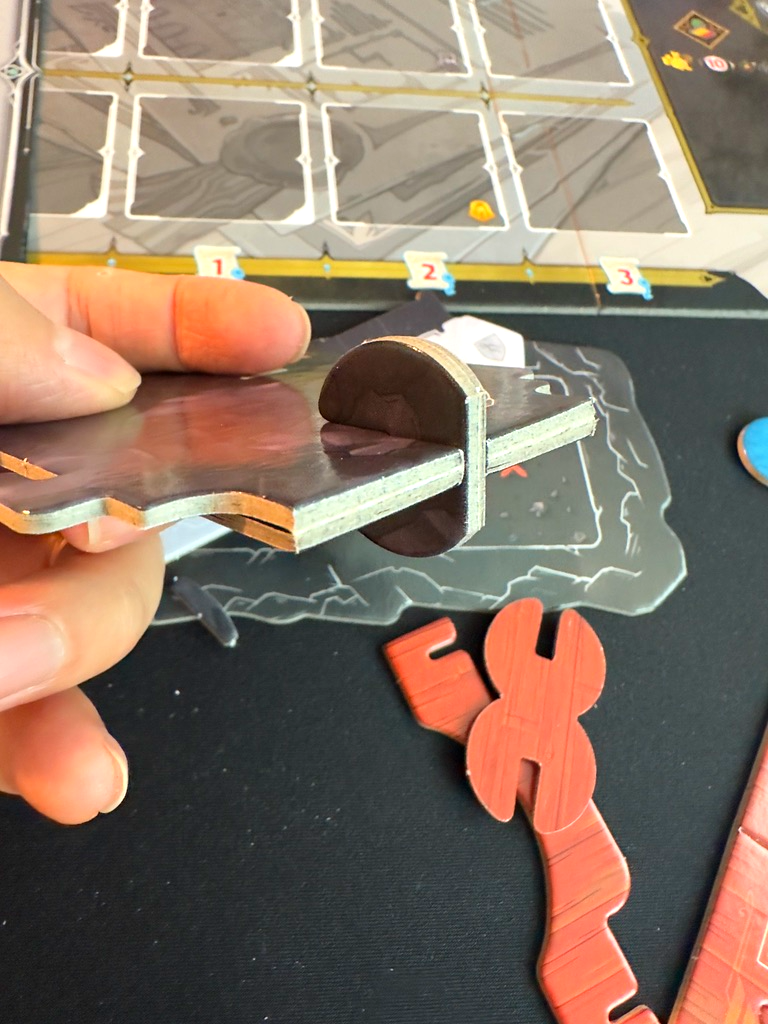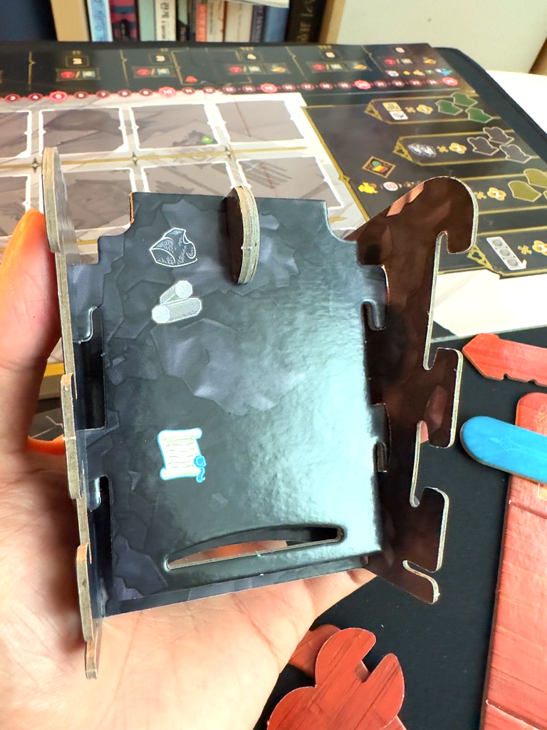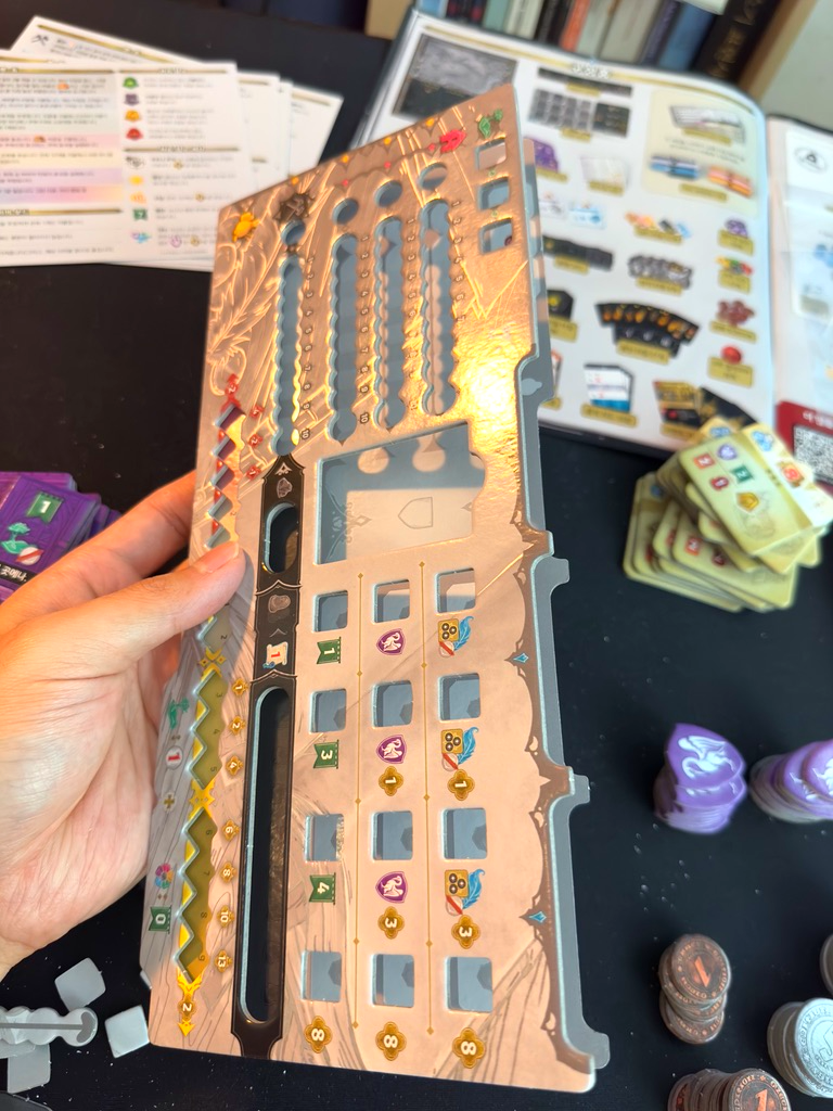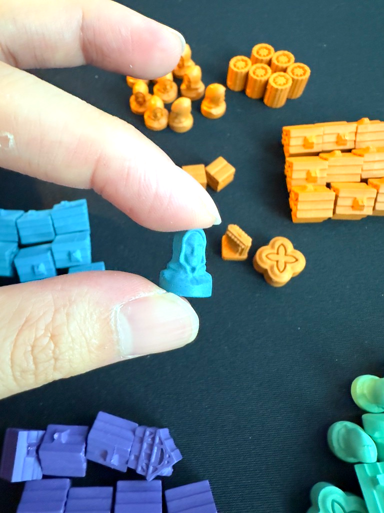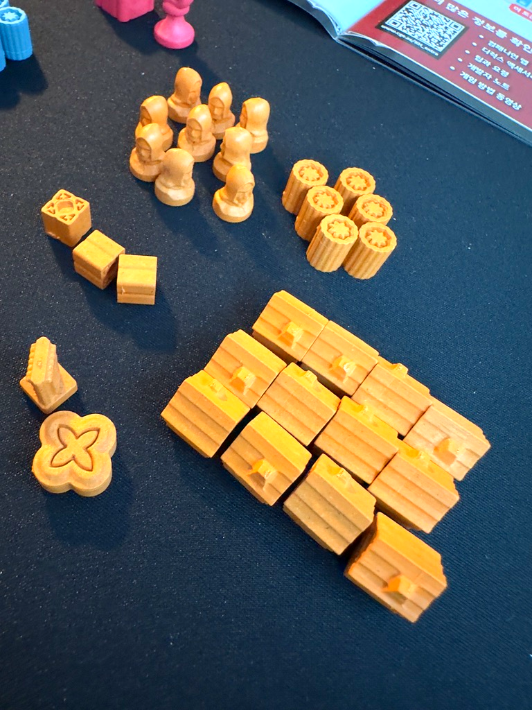 사실 타일은 펀칭 보드가 아무리 퀄리티가 좋아져도 아직은 한계가 있기 때문에 그게 그거지만 카드가 묘하게 재질이 좋아진 것 같다는 생각이 들었다. 약간 종이면서 플라스틱 같은 재질이라고 해야 하나? 코팅을 잘해서 그럴지도 모르겠으나 카드의 질이 생각보다 좋아서 놀랐다. 그리고 컴포넌트에서 이게 나무인지 플라스틱인지 모를 재질이었는데 3D 프린트로 만든 것 같은 느낌이 들었다.