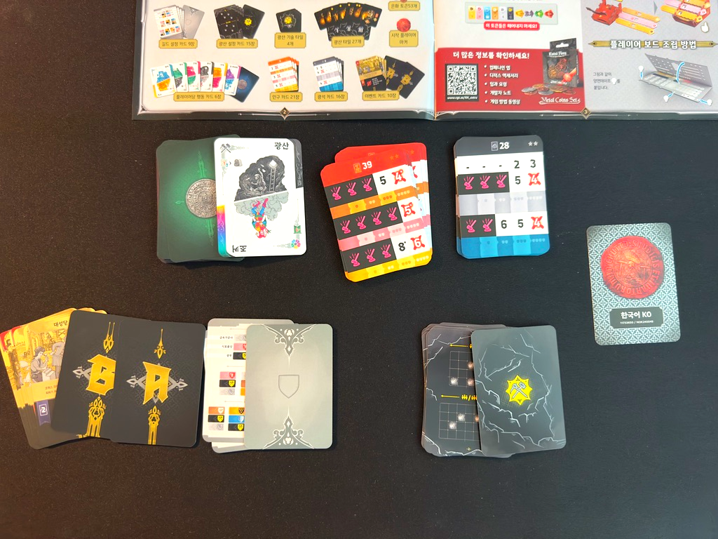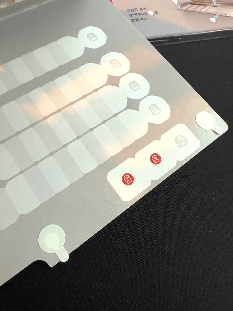 딱 개봉하자마자 프로모션 카드가 떡하니 테이프로 붙어 있어서... 그것도 좀 의아했다. 비닐에 테이프를 붙이니 손상이 될 수 있기 때문에 이런 부분이 예민한 사람들에게는 거슬리는 포장과 배달일 것이다. 그래도 무사히 왔으니 다행이긴 하나... 컴포 자체가 그렇게 맘에 들지 않은 건 안 비밀. 플라스틱 마커들과 카드는 참 질이 좋았는데 펀칭 보드가... 너무 위태위태했다고나 할까?