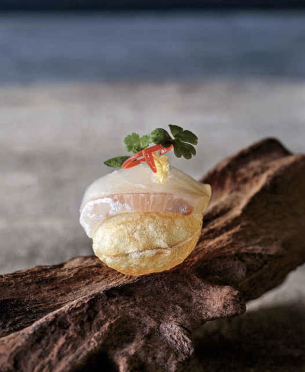 - Place 1 dot of mayonnaise on each serving plate. Place 1 pomme soufflé on top of each dot of mayonnaise. Top each piece of cured red snapper with 1 lemon rind curl, 1 Fresno chile slice, and 1 small parsley leaf. Season with a small pinch of Maldon salt.