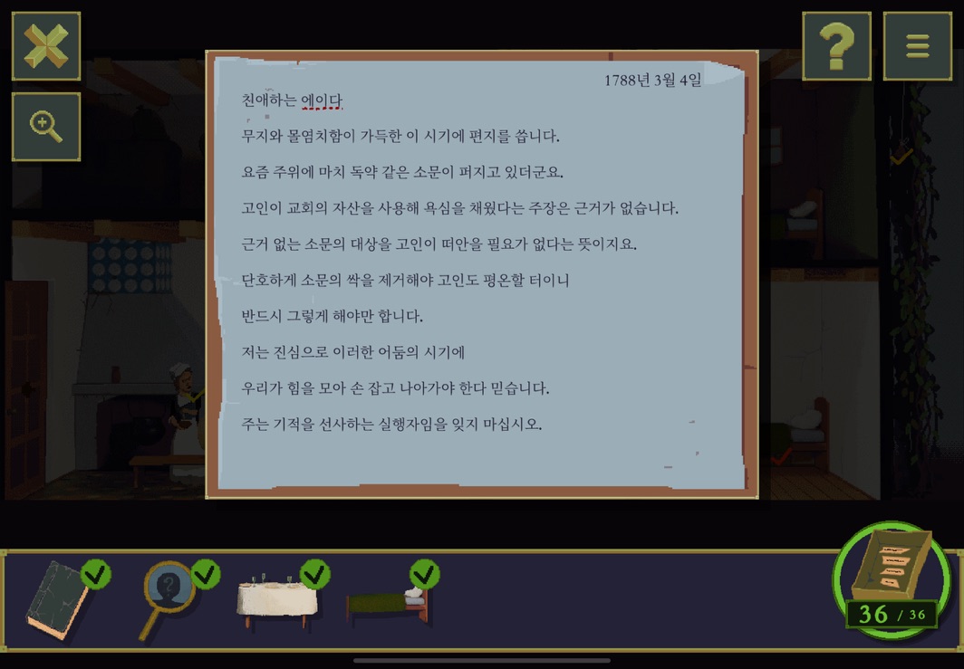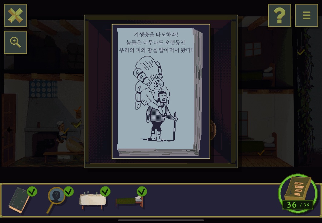 방의 주인이 누구인지 보려면 소지품들을 봐야 한다. 이 사람은 귀족에 대한 우화집과 귀족에 대한 풍자 및 타도 포스터를 침대 아래서 보관하는 것으로 보아 우선 귀족에 불만을 가지고 있다는 것을 알 수 있다. 그리고 일기를 통해 이 집에서 오랫동안 일을 하고 있다는 것을 알 수 있다.