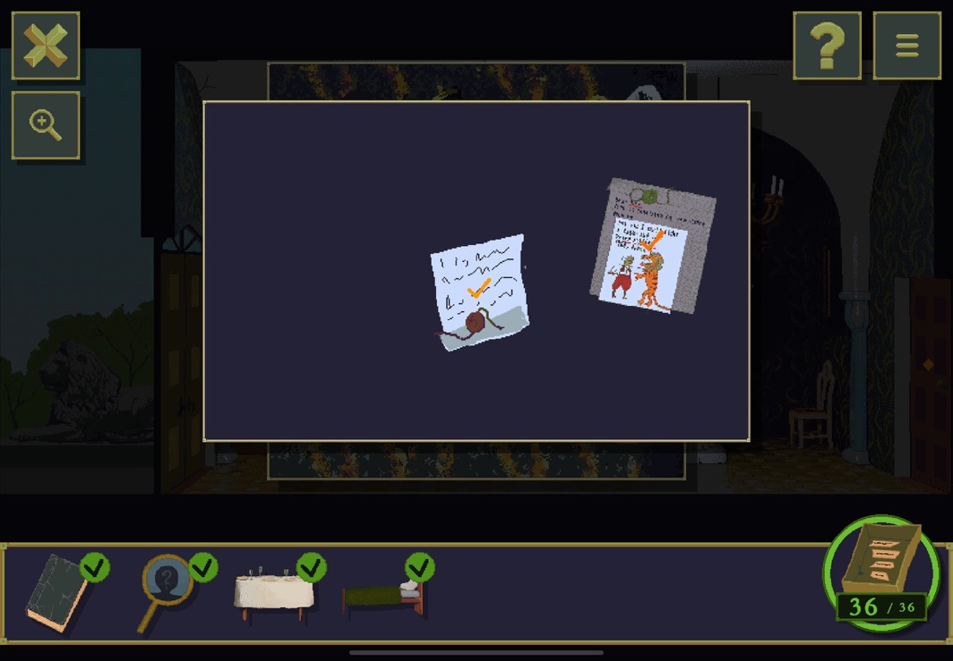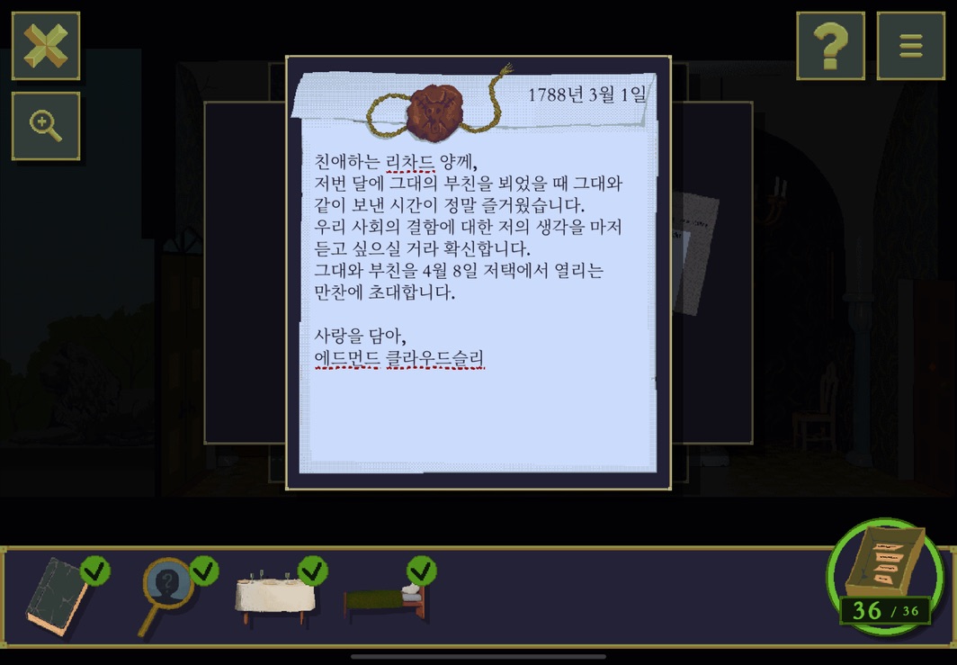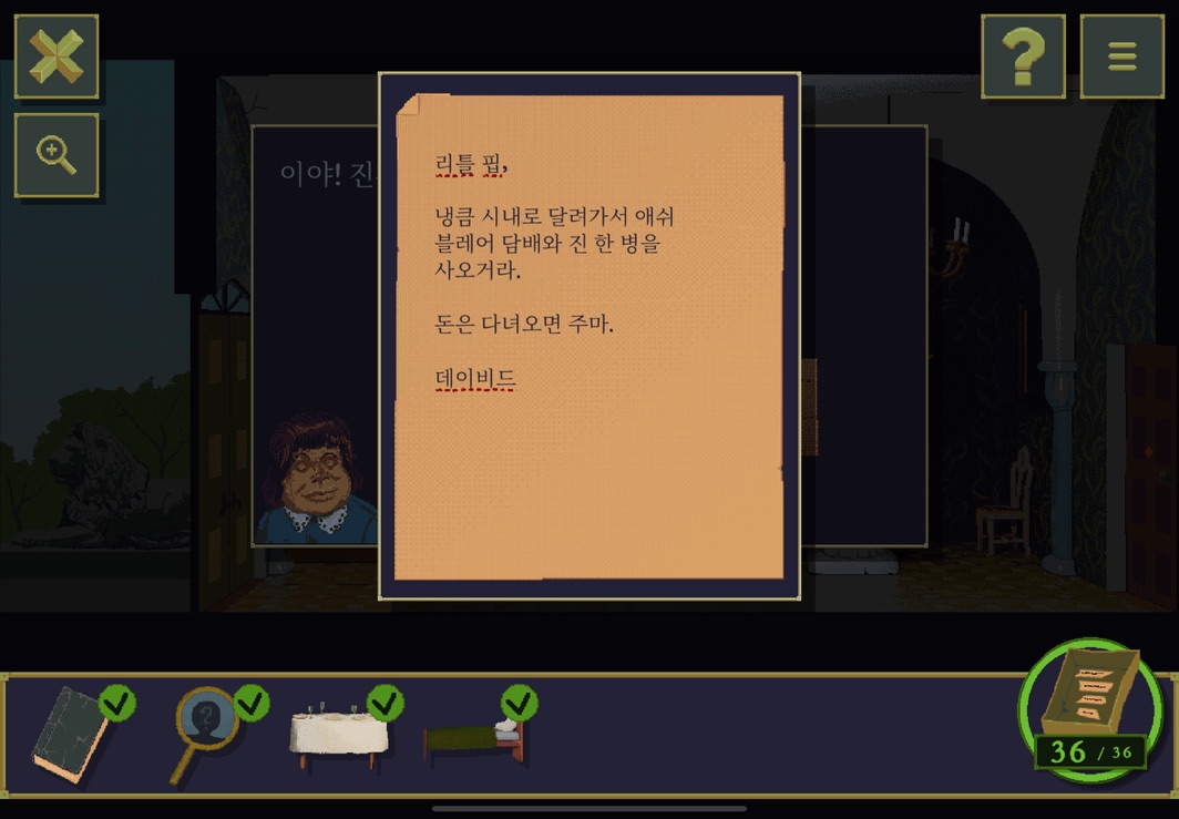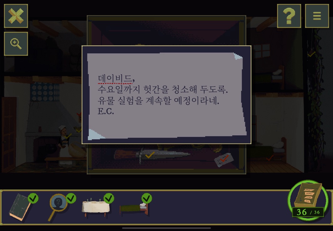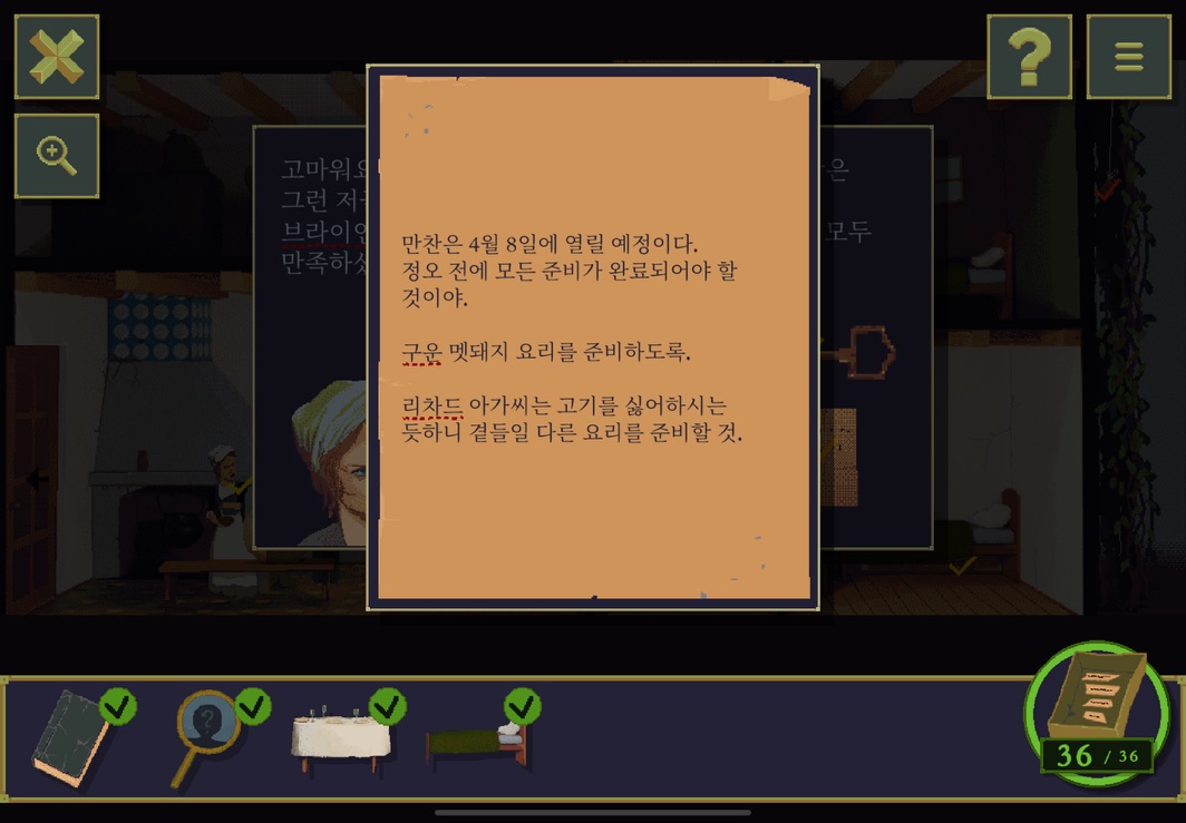 여기서부터 단서들을 잘 살펴봐야 한다. 이 방들의 주인들이 누구인지 그리고 등장인물들이 누구인지 사소한 힌트들을 잘 기억하면서 하나씩 소거해 나가면 좋다.