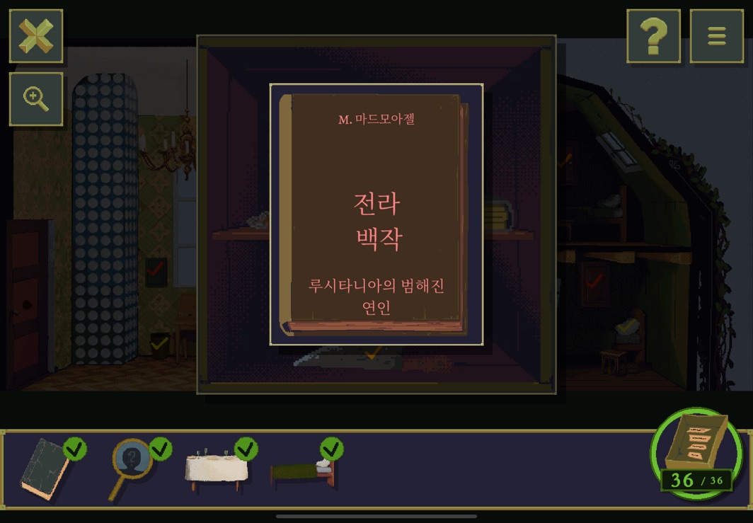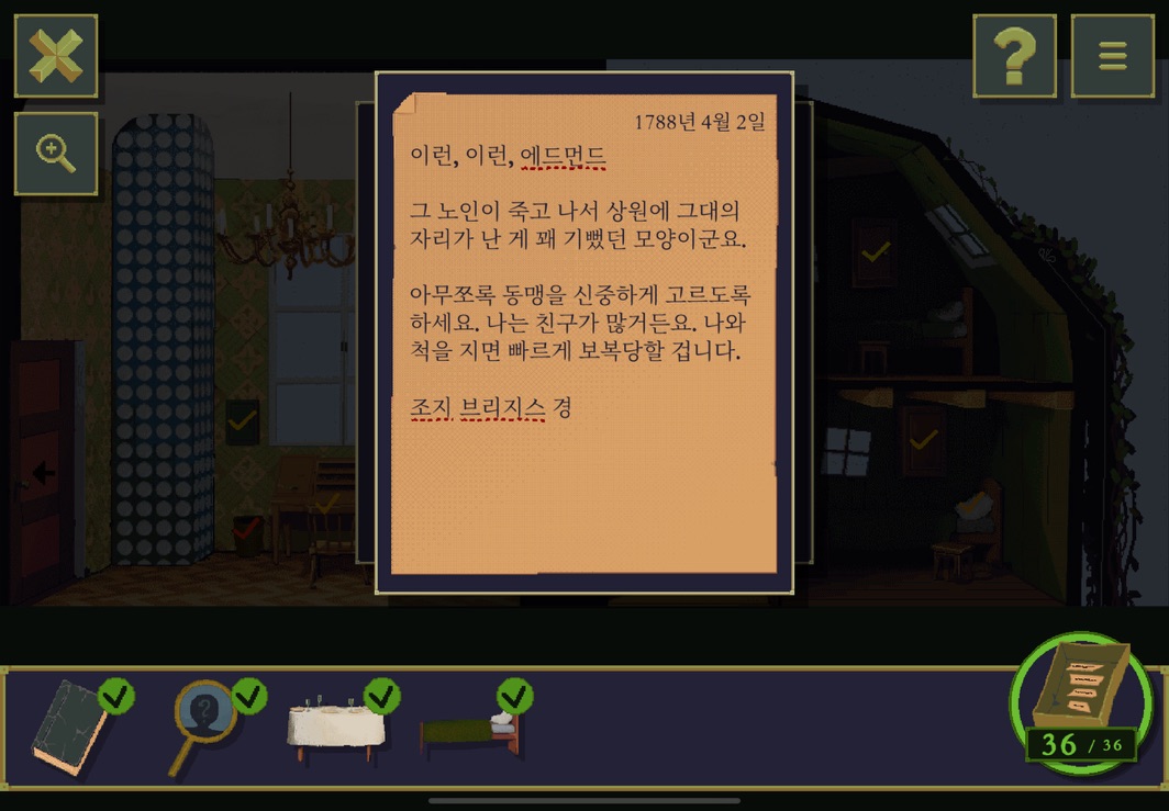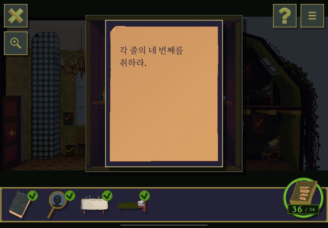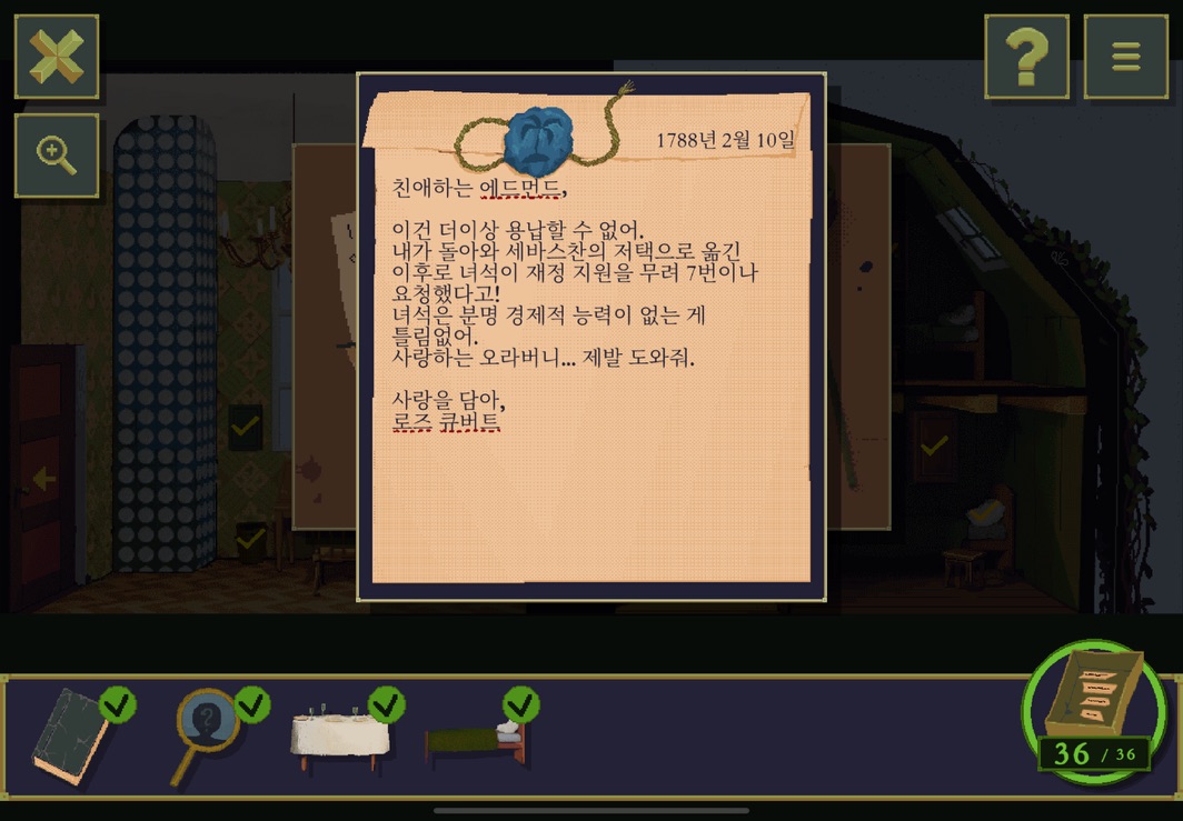 2층방이 아주 중요한 힌트들이 많다. 물론 아래층으로 다시 돌아가야 하는 부분도 있기는 하지만 그래도 2층방에서 대부분의 힌트들이 풀리기 때문에 가장 집중을 해서 뒤져보고 단서들을 조합해야 한다.