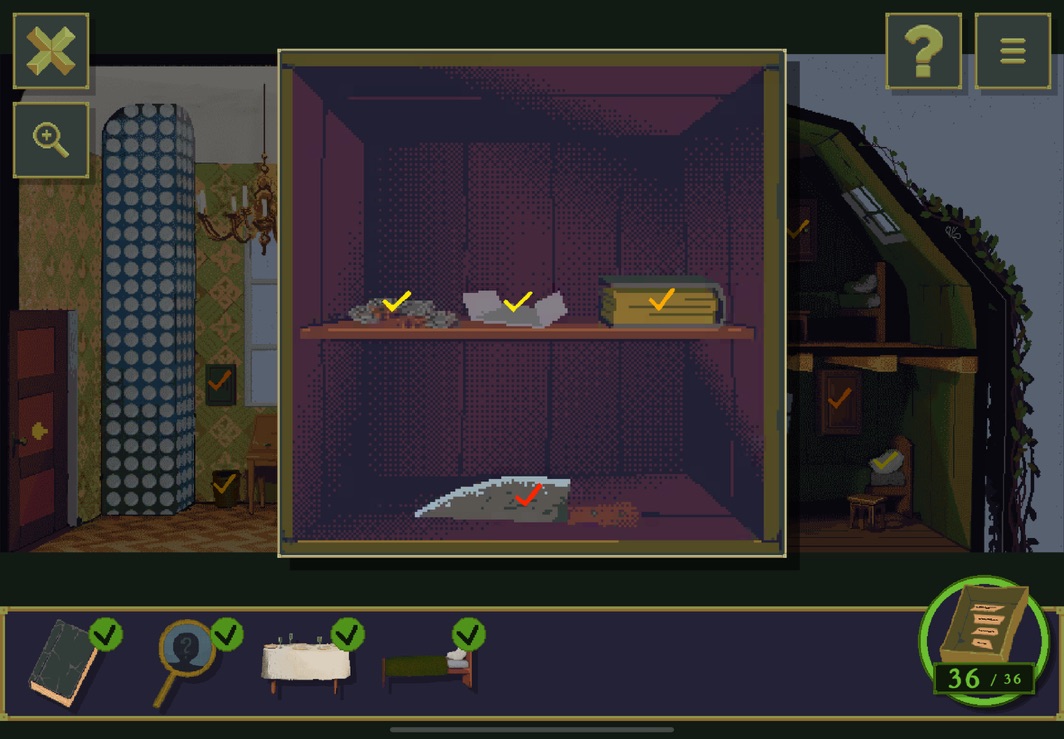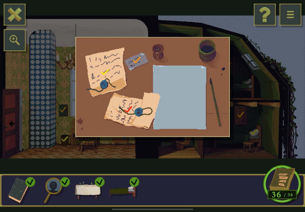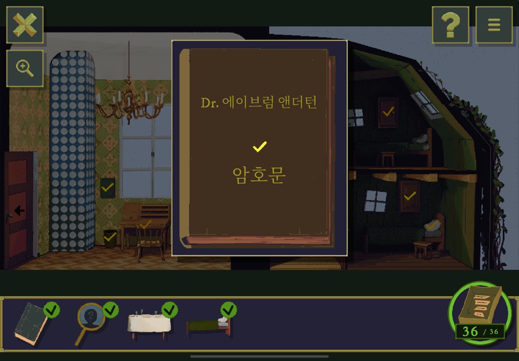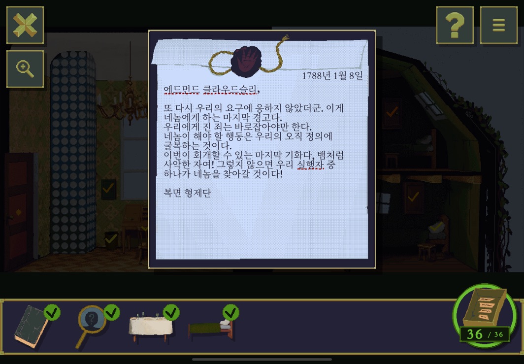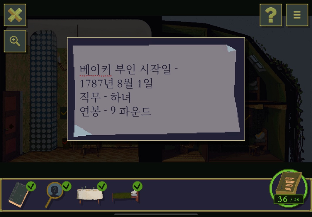 2층방이 아주 중요한 힌트들이 많다. 물론 아래층으로 다시 돌아가야 하는 부분도 있기는 하지만 그래도 2층방에서 대부분의 힌트들이 풀리기 때문에 가장 집중을 해서 뒤져보고 단서들을 조합해야 한다.