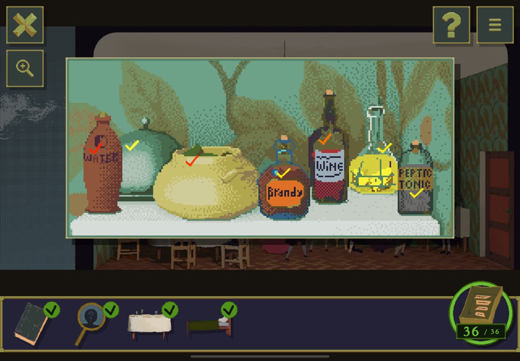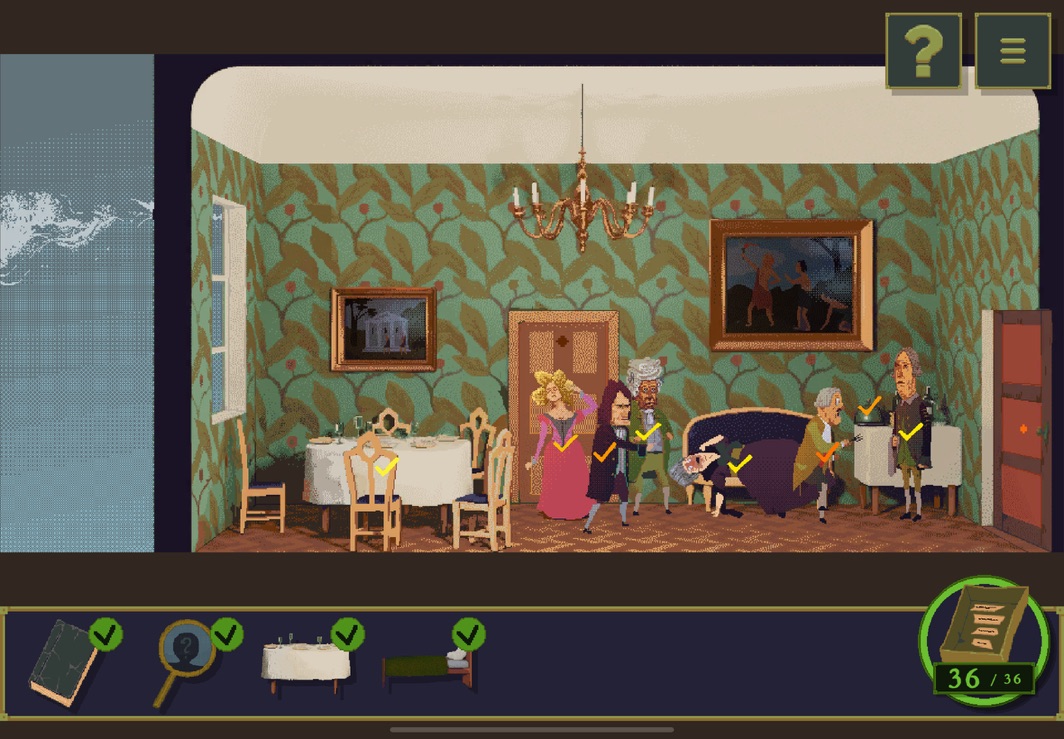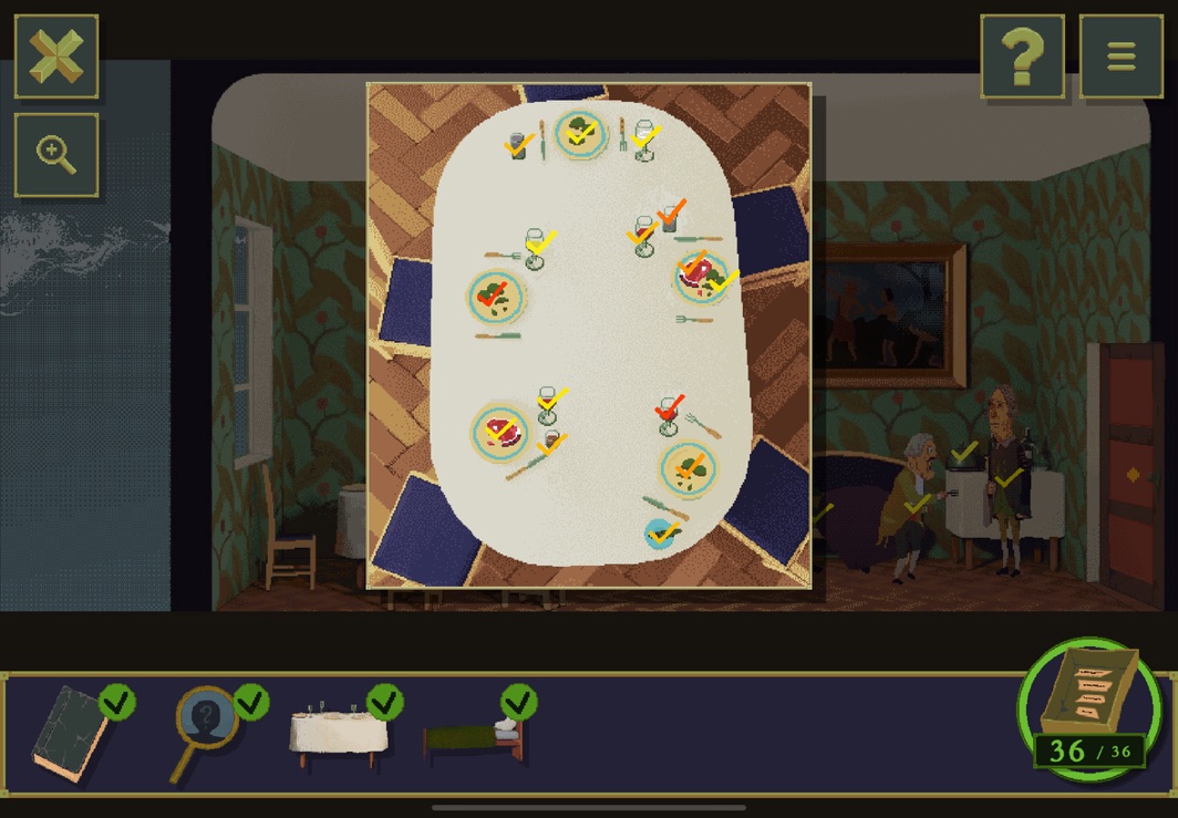 이 식당을 먼저 오면 혼란이 가중될 수 있기 때문에 식당은 다른 장소들에서 힌트를 모두 모은 다음에 오는 것이 좋다. 다른 정보들을 모두 파악을 하고 와서 누가 이 식당의 식탁에 앉았고 그리고 무엇을 먹고 마셨는지를 파악해야 한다. 그리고 인물들의 이름도 확실해진다.