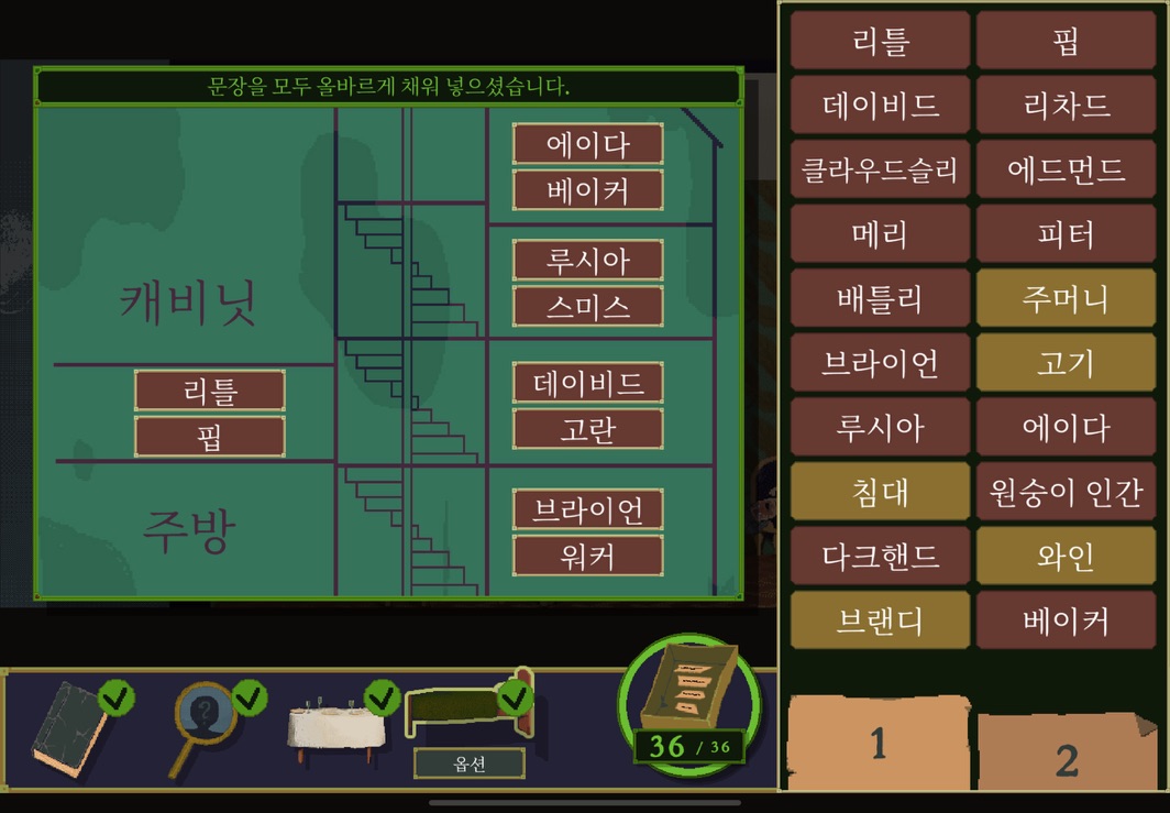 사실 루시아 스미스, 브라이언 워커의 경우 이름은 있지만 성이 없거나 성은 있는데 이름이 없는 경우가 있다. 그래서 조금 쉽지 않지만 다른 사람들이 대부분 쉽게 풀리기 때문에 남은 이름을 하나씩 넣어 보면 풀리긴 한다. 브라이언 같은 경우에는 루시아의 대화와 할 일 목록에서 이름과 성이 모두 나오고, 루시아 스미스 같은 경우에는 루시아 에이다의 대화와 역시 할 일과 오너먼트에서 유추할 수 있다.