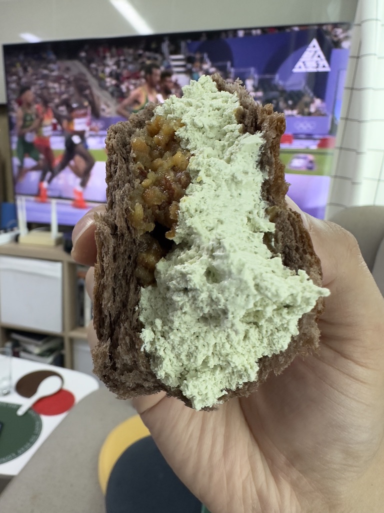 우선 피스타치오는... 딱 입에 무는 순간 확실히 느낄 수 있다. 브라보콘의 향기를. ㅋㅋㅋ 브라보콘 피스타치오맛을 맛본 사람이라면 확실히 느낄 수 있을 것이다. 피스타치오크림은 거의 비슷하고 빵 안쪽에 들어있는 피스타치오 견과가 씹히는 순간 확실히 브라보콘의 향기가 느껴진다.