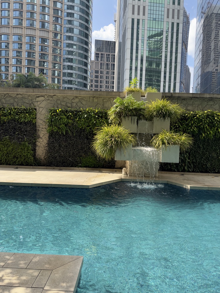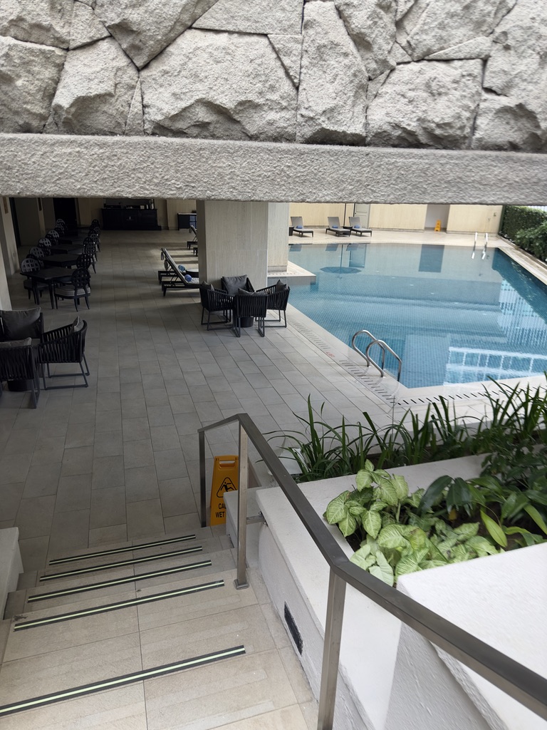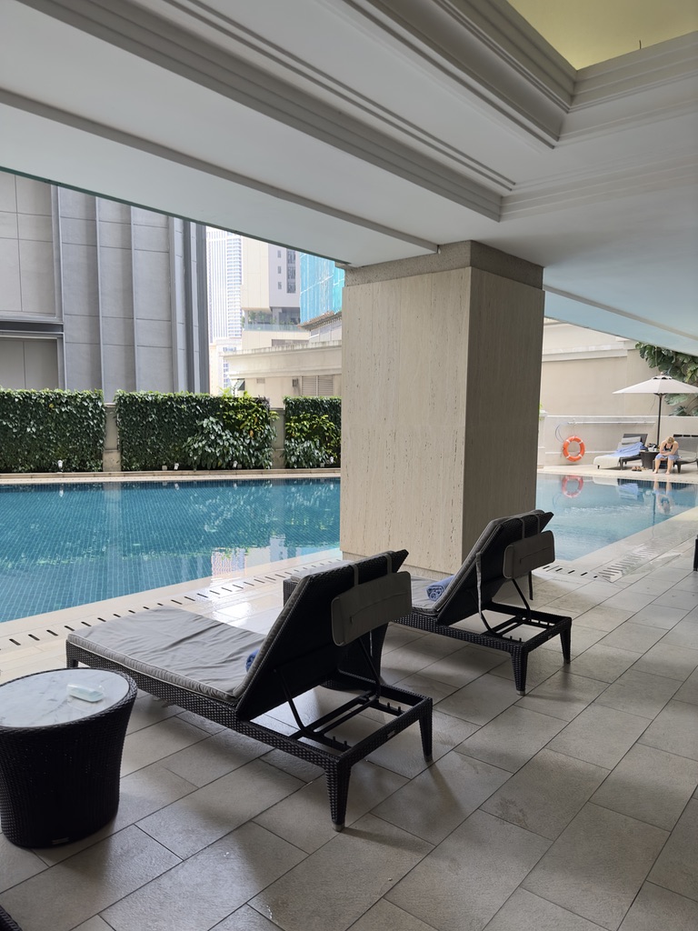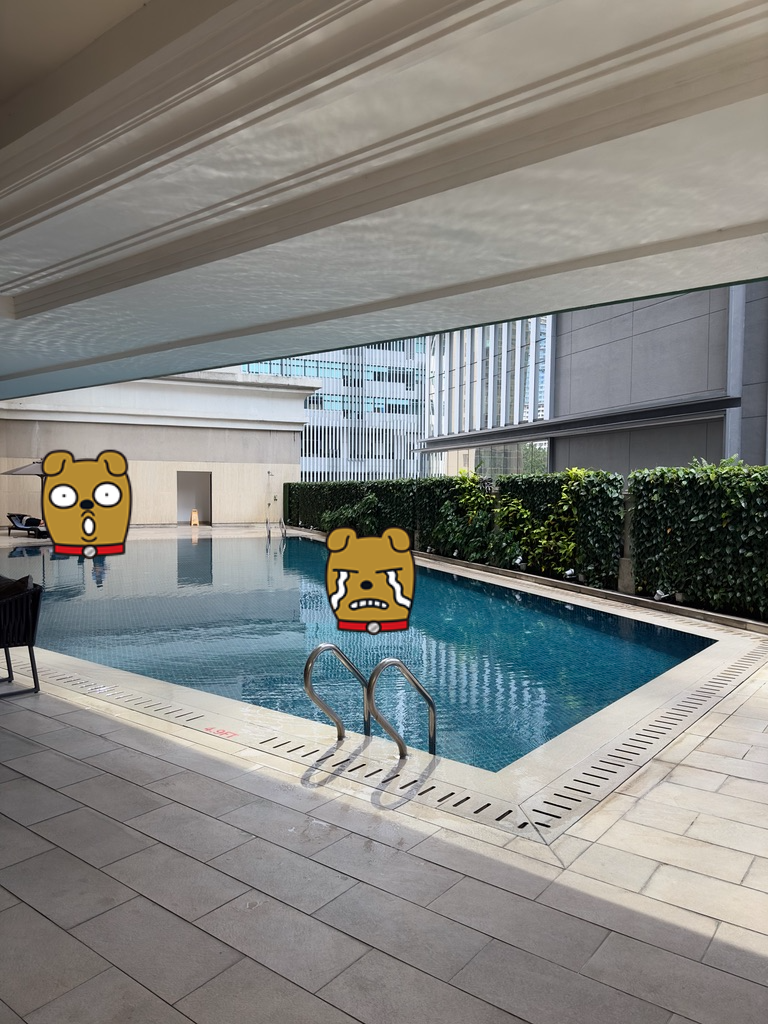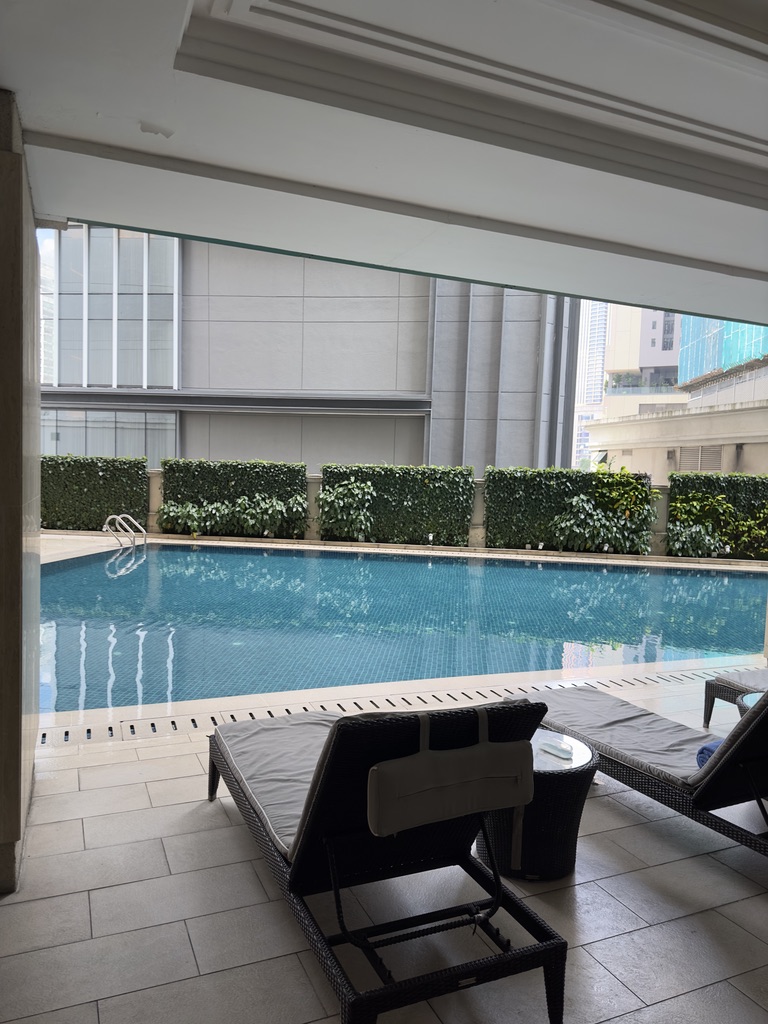 리츠 칼튼 쿠알라룸푸르의 경우에는 수영장이 2개가 있다. 뭐... 말로는 어린이용 풀과 일반풀 2개로 나뉘어 있다고 하지만 둘 다 꽤 깊다. 성인 남성 기준 최소 가슴 높이까지 온다고 할 수 있기 때문에 두 수영장 모두 어린이용은 아닌 듯하다. 엘리베이터에서 내리면 바로 오른쪽에 체크인하는 곳이 있는데 직원이 없으면 그냥 통과해도 된다. 그리고 그 체크인하는 곳 바로 뒤로 탈의실과 사우나가 있다.