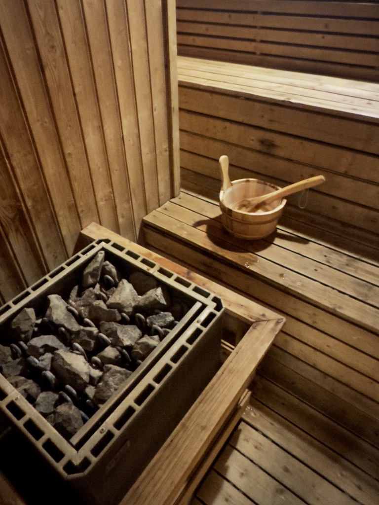 건식 사우나에는 뜨거운 돌이 있어서 물을 뿌리면서 있으면 더 뜨겁게 사용을 할 수 있다. 역시 여기도 나무들이 오래되어서 썩은 부분이나 깨져있는 부분이 있기 때문에 조심하길 바란다.