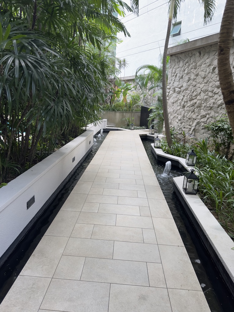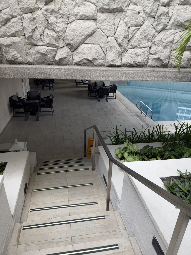 이쪽을 지나서 계단이 있는데 계단 위로 올라가면 중정처럼 꾸며진 통로가 나온다. 이 통로를 지나면 두 번째 수영장으로 갈 수 있다.