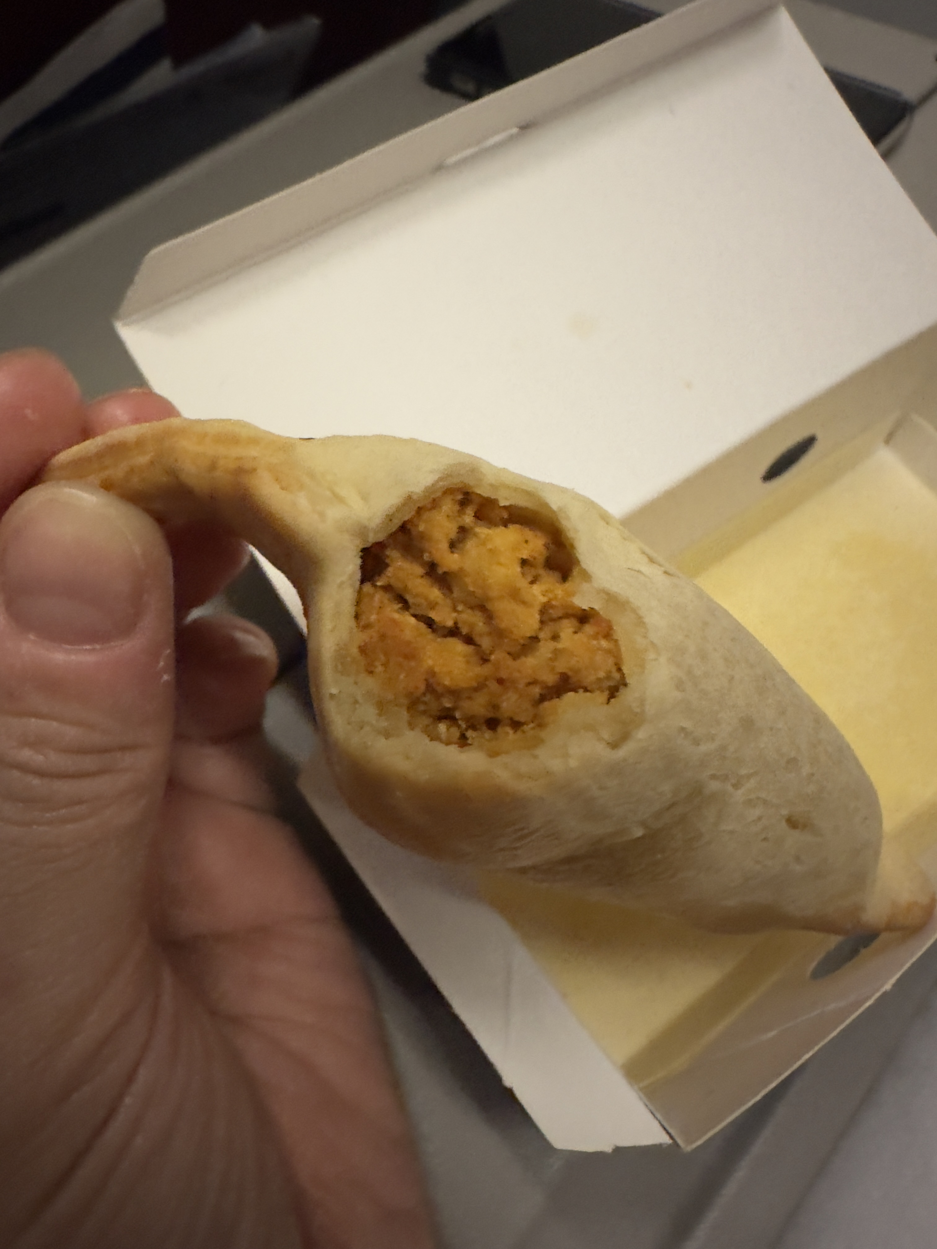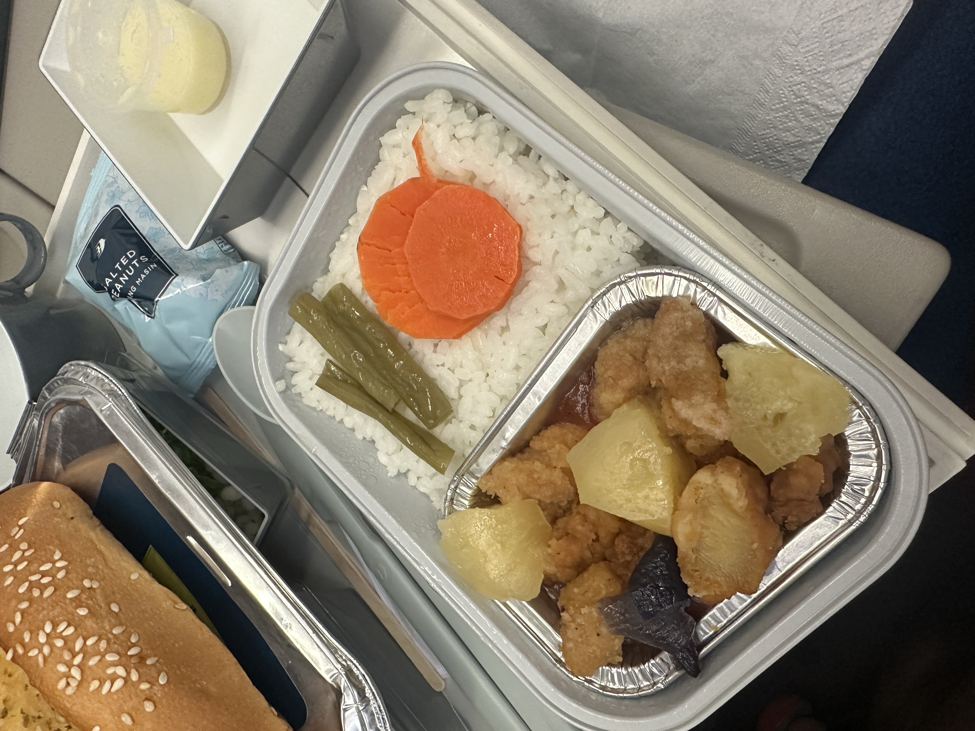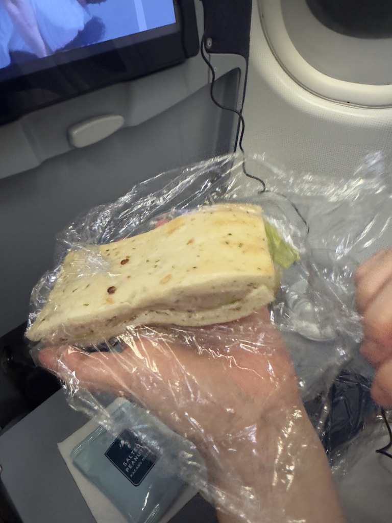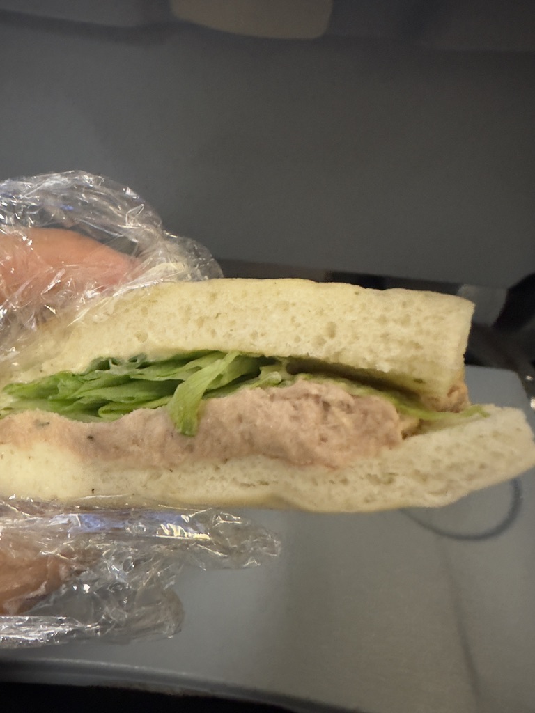 하지만 반대로 쿠알라룸푸르에서 인천을 갈 때에는 오후 비행기라서 저녁을 먼저 주고 내리기 전에 스낵을 주는 형식이었다. 스낵의 경우에는 새벽에는 샌드위치를 그리고 오후 비행기에서는 카레 포켓 같은 스낵을 받았다. 솔직히... 둘 다 맛은 없다. 샌드위치는 2가지 중 하나로 참치와 닭고기를 고를 수 있고 포켓은 베지와 카레 두 가지 맛이 있었다. 우리는 둘 다 샌드위치는 참치, 그리고 나머지는 카레로 결정했다.