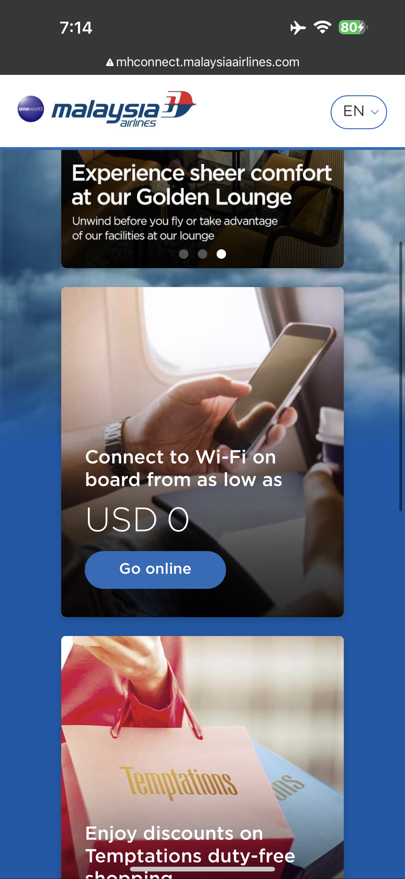 - 말레이시아 항공 웹사이트가 열리면 밑으로 화면을 스크롤하면 Go online이라는 버튼이 나오고 그걸 누르면 연결이 된다.