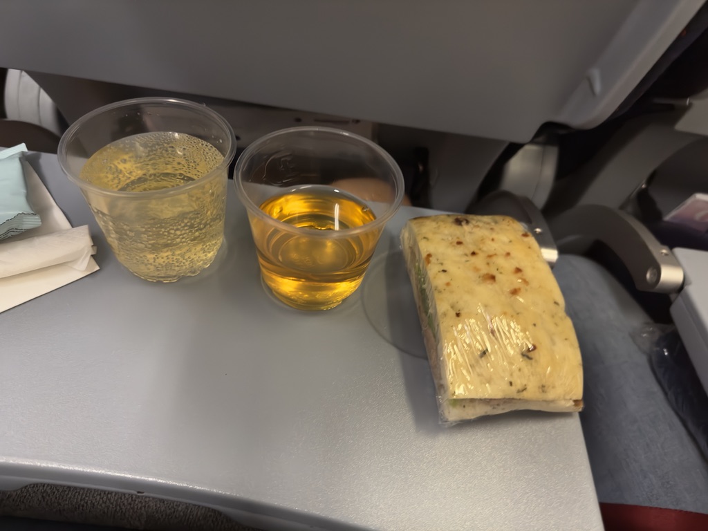 기내식의 경우에는 스낵과 기내식 한 번씩 나온다. 6시간 반 정도 되는 비행이지만 밤비행이기 때문에 기내식 한 번과 스낵까지 주는 것 같다. 인천에서 쿠알라룸푸르로 갈 때는 밤~새벽 비행기였기 때문에 인천 출발은 자정이 지난 시간이어서 새벽에 무언가를 먹기에는 부담이 되어서 오히려 샌드위치 정도가 적당하다고 본다.