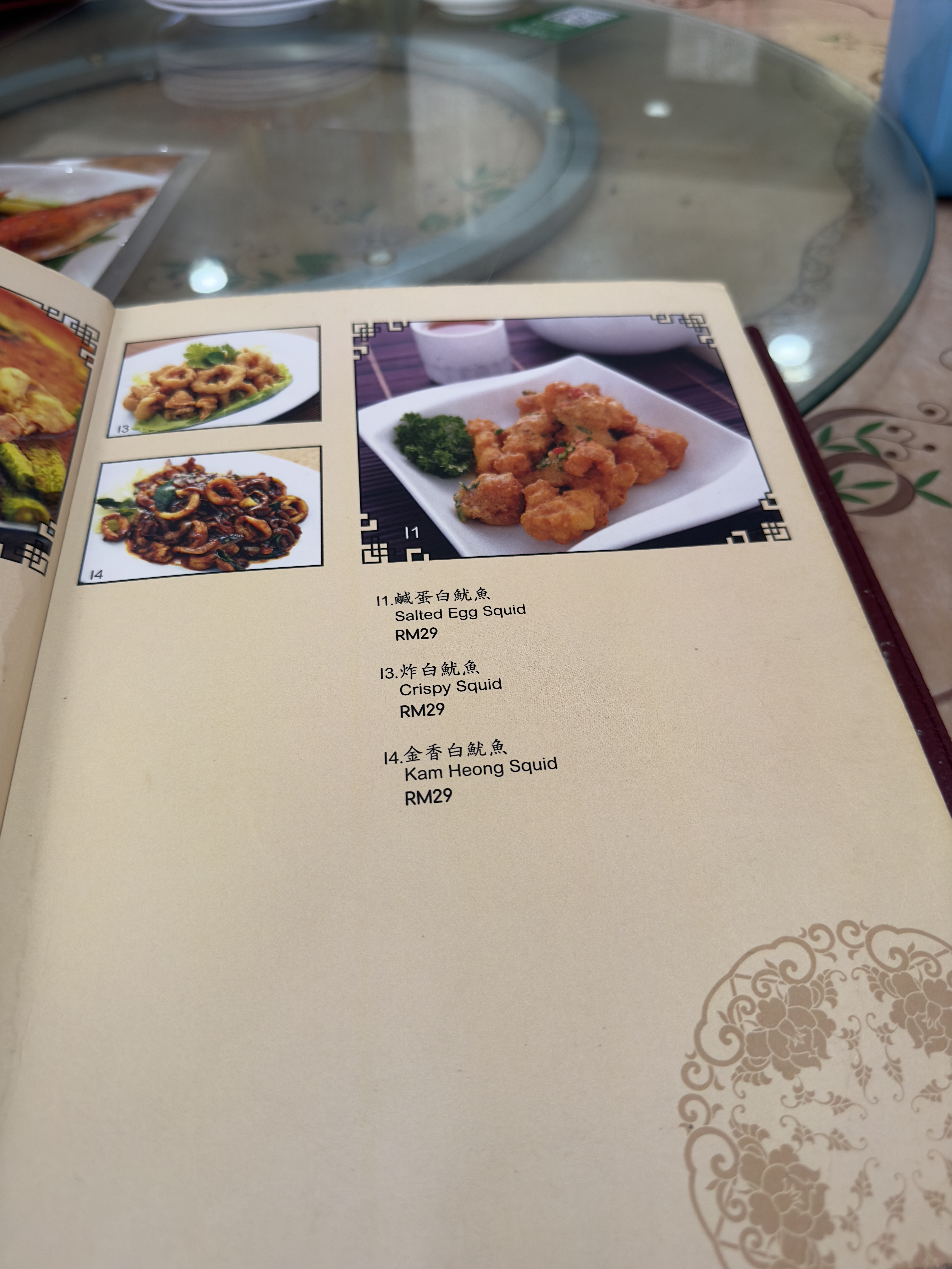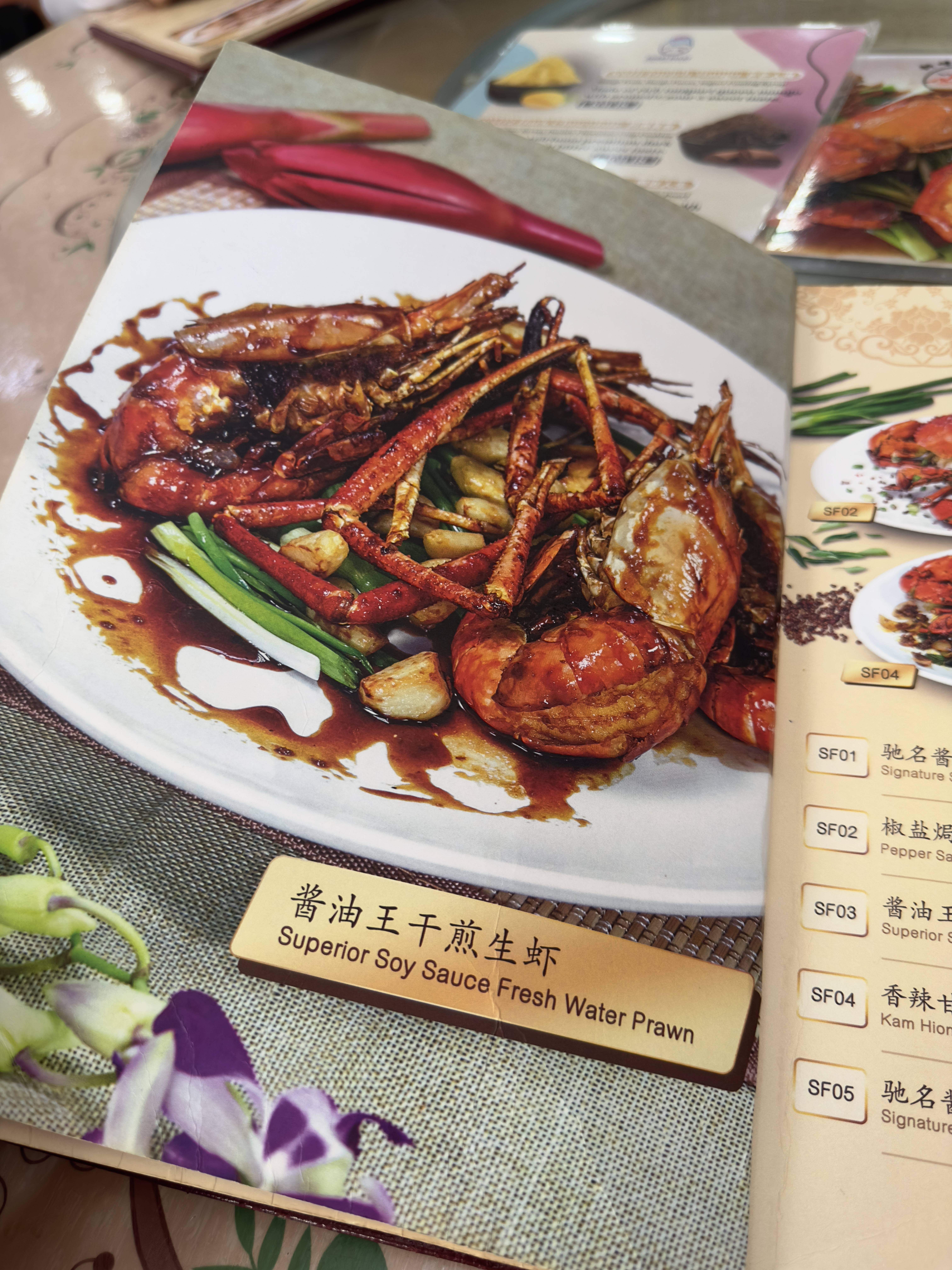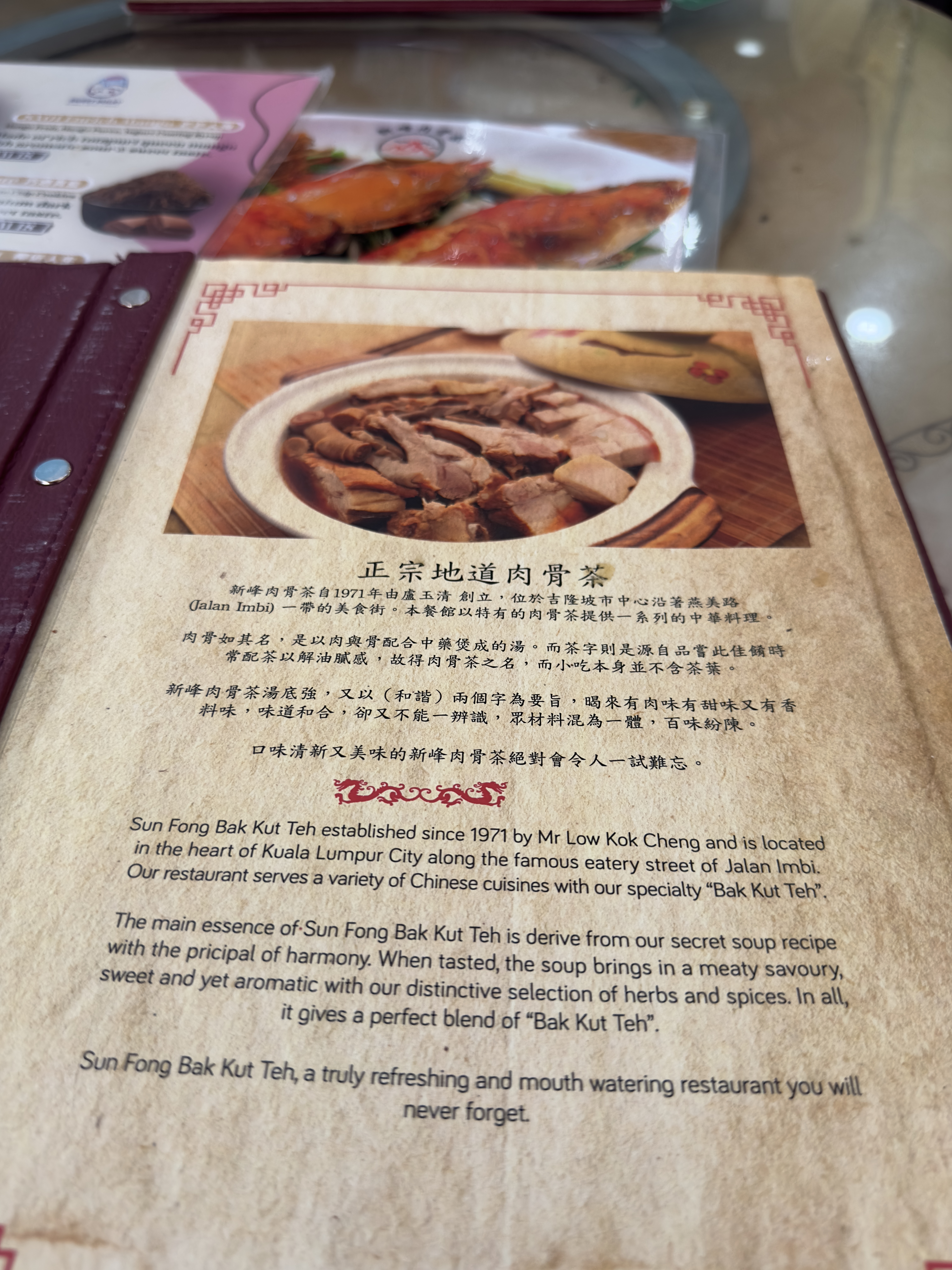 테이블에 안내를 받고 메뉴를 살펴보니 바쿠테뿐만 아니라 해산물도 있었다. 바쿠테집에서 무슨 해산물을 하지?라는 생각을 하기도 했지만 중국의 식당은 메뉴의 수로 그 주방장의 실력을 드러낸다고 하니 뭐... ㅋㅋ 우리는 국물 바쿠테 2인용, 드라이 바쿠테 2인용, 공심채 삼발 볶음, 차이브 숙주 볶음, 족발, 밥을 주문을 했고 차나 음료는 따로 시키지 않았다. 이번 여행에서 가장 특이한 점은 우리가 물과 음료를 전혀 시키지 않았다는 점이다. 어디서 어떤 내용을 들었는지 알 순 없지만 임산부인 제수씨를 위해서 엄마가 물을 페트병으로 바리바리 싸들고 왔기 때문에 나머지 사람들은 졸지에 단수를 당했다. ㅋㅋ