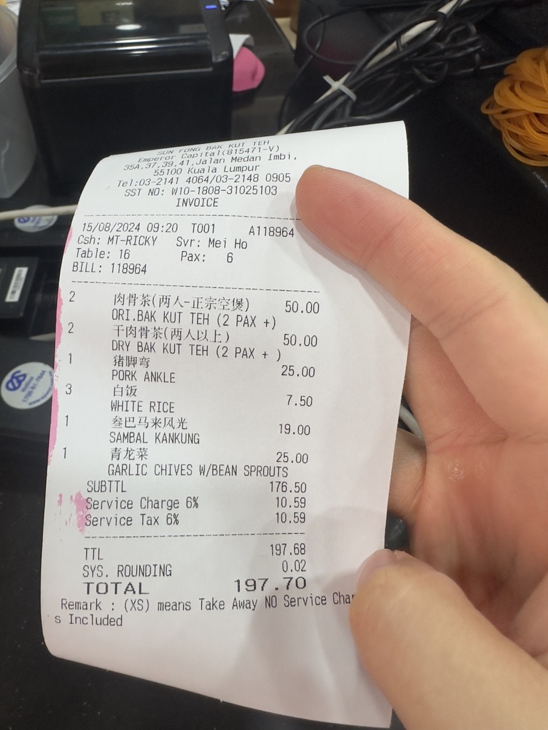 그리고 현금이 아닌 카드 사용이 가능하다. 하지만 영수증 자체에 시키지 않은 메뉴를 몰래 추가하는 경우가 있으니 동남아에서는 영수증을 잘 살펴보고 결제하길 바란다. 그리고 세금으로 6%, 서비스 차지로 6%가 붙기 때문에 일반 가격에서 적어도 12%가 더 올라가는 걸 고려해야 한다. 서비스 차지의 경우에는 6~10% 정도로 매장마다 다르고 세금은 무조건 6%이기 때문에 잘 살펴봐야 한다. 우리는 총 197.70 링깃이 나왔고 당시 환율로 6만 원 정도가 나왔다.