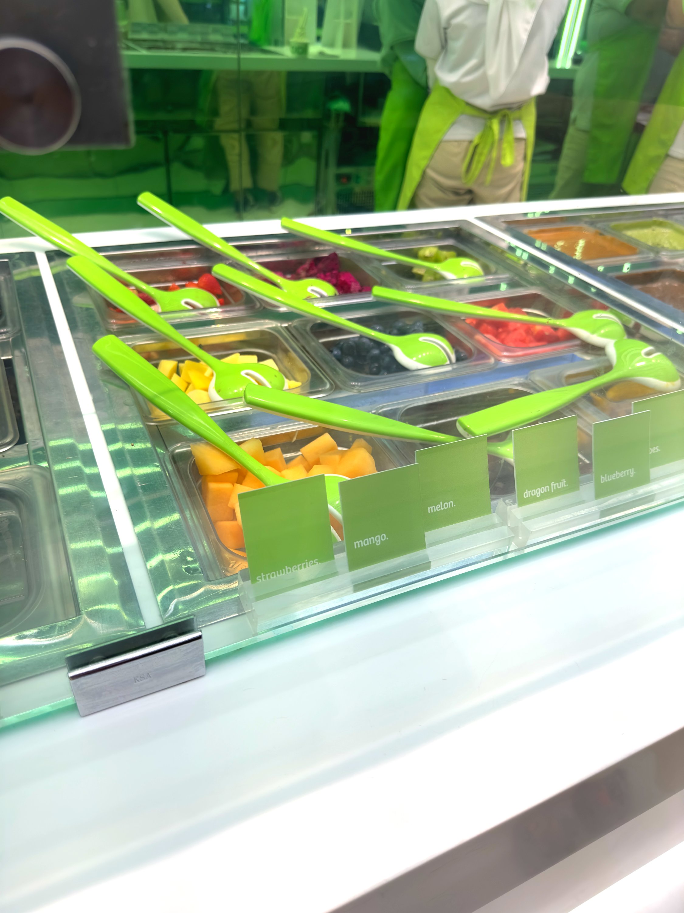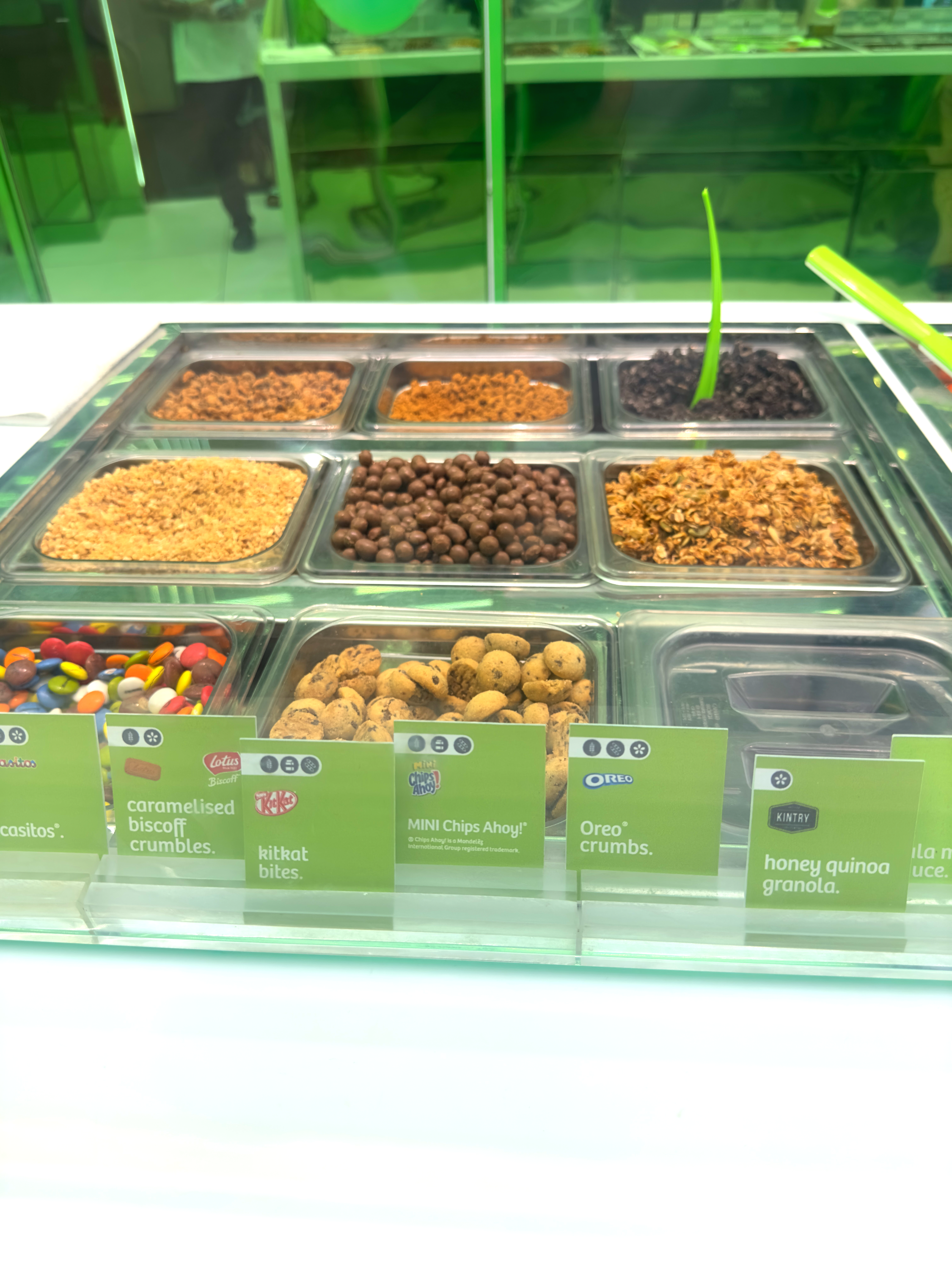 그리고 미디움과 라지는 모두 아이스크림 양만 다르고 토핑 자체는 3가지를 고를 수 있다. 가장 가성비는 미디움에 3가지 토핑을 고르는 것 같다. 토핑은 과일 종류, 바삭거리는 그레놀라나 쿠키, 초코볼 종류가 있고 마지막으로 소스류가 있다. 이 소스류가 압권인데 초코, 카라멜, 피스타치오, 로투스로 만든 소스, 꿀 등 다양하고 정말... 미치도록 달다.