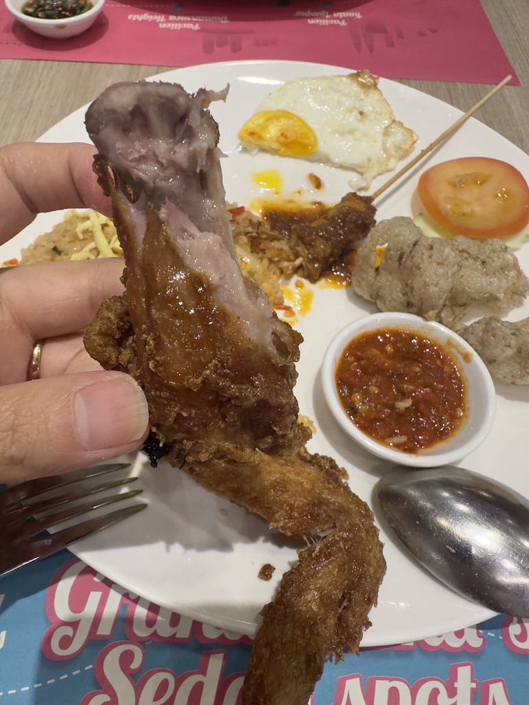 그리고 나온 나시고랭과 치킨, 사테. 이번 말레이시아 여행에서 치킨을 이곳 그랜드마마에서 밖에 못 먹어 봤지만 한가지 확실한건 말레이시아 치킨이 정말 맛있다. 태국도 한 치킨 하지만 말레이시아 치킨은 육향과 함께 쫄깃함이 느껴지면서 육즙이 입안으로 퍼지는게 아주 좋았다. 치킨을 잘 튀겨서 그런 것 일 수도 있으나 원육 자체가 한국 종과는 다른 느낌을 주기 때문에 나시르막에 나오는 치킨이 아닌 다른 치킨을 먹어보는 것도 추천한다.