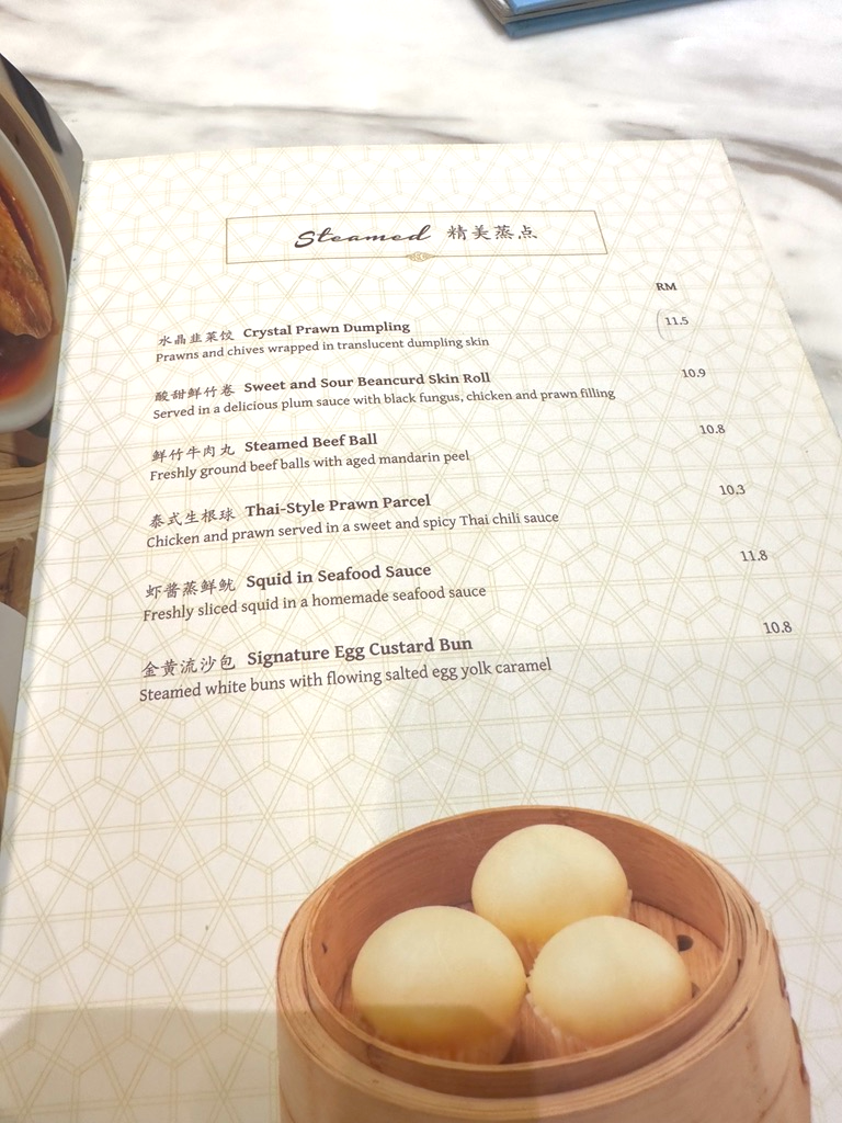그래도 이리저리 시키고 보니 5~6가지 시키긴 했지만 이상하리만큼 더 시키고 싶지 않았다. 종업원이 계속해서 신메뉴로 삼발이 들어간 말레이사이 풍 딤섬을 권했지만 시키지 않았다. 전체적인 가격은 한국보다 한 2~3천 원 정도 싸다. 그리고 아쉬운 건 돼지고기가 없기 때문에 소룡포, 샤오롱바오가 없다는 점이다. ㅜㅜ