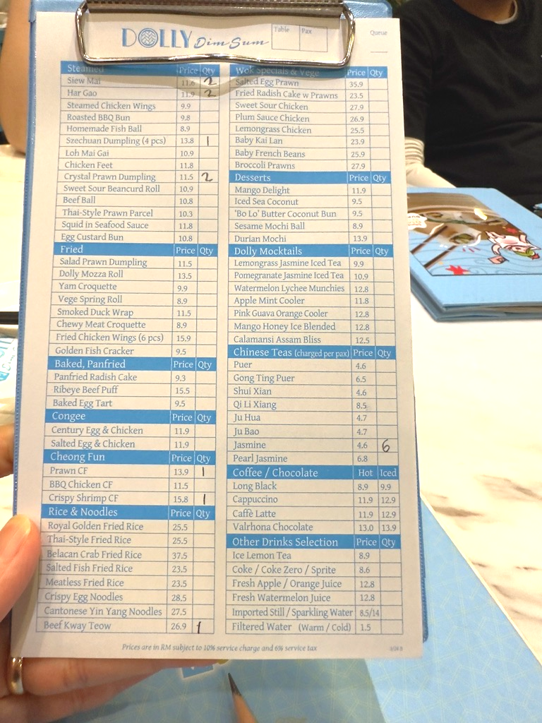 파빌리온 지하에 위치해 있는 이 돌리 딤섬은 체인이기 때문에 수리아 몰이나 큰 몰에는 거의 대부분 있는 것 같다. 매장 자체는 크지 않고 주말 저녁이었기 때문에 웨이팅이 있을 것 같았지만 그래도 우리가 갔을 당시에는 바로 앉을 수 있었다. 물론 6명이나 되는 인원이었기 때문에 매장 안쪽에는 앉을 수 없었고 밖에 테이블을 붙여서 앉았다. 조금 아쉬웠던 점은 앉은자리가 너무 매장의 안쪽과 밖을 이어주는 곳이었기 때문에 안쪽에서 식사를 마친 사람들이 밖으로 나오기 위해서 지나다녔기 때문에 사람에 치일 수밖에 없었다는 점이다.