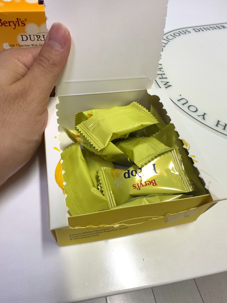 동생네 부부는 다양하게 벌크형으로 들어있는 제품을 구매했고, 우리는 기본형을 먹어 봤으니 화이트 초콜릿 아몬드는 선물용으로 사고 레몬팝, 두리안, 크런치 2개를 우리가 먹을 것으로 샀다. 그리고 선물해서 지인들에게 평가를 들어본 결과 확실히 초콜릿이 맛이 있다고 했다. 이 베릴스만의 초콜릿 맛이 있는데 꽤나 진득하면서도 너무 과하지 않은 달달함과 씁쓸함이 정말 좋다.