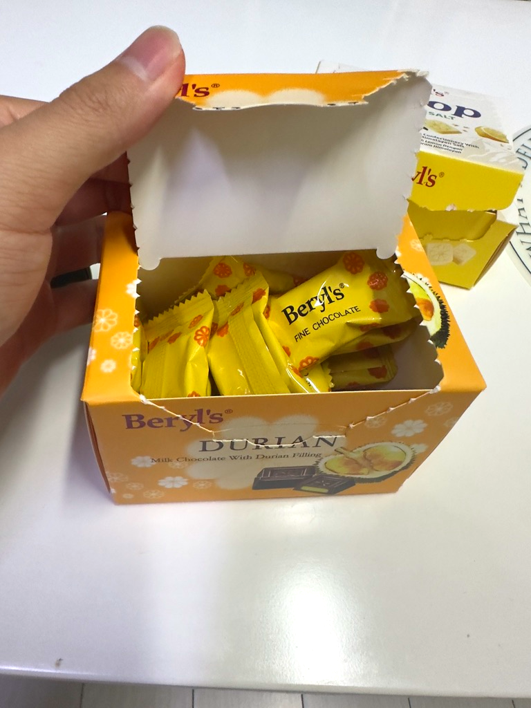 함부로 사지 말라... ㅋㅋ 동결 건조된 두리안에 초콜릿이 있는데 두리안을 좋아하거나 두리안 동결 건조를 참을 수 있는 사람만 먹는 것을 권장한다. 생각보다 두리안의 맛이 강하게 느껴지고 동결 건조된 두리안의 특성상 물과 만나면 확산이 되기 때문에 입안뿐만 아니라 주위에도 냄새가 엄청나게 퍼진다. 그리고 일반 동결 건조 두리안보다 생각보다 향과 맛이 강하기 때문에 두리안을 좋아해도 조금 힘들 수 있다. 하지만 맛있다.