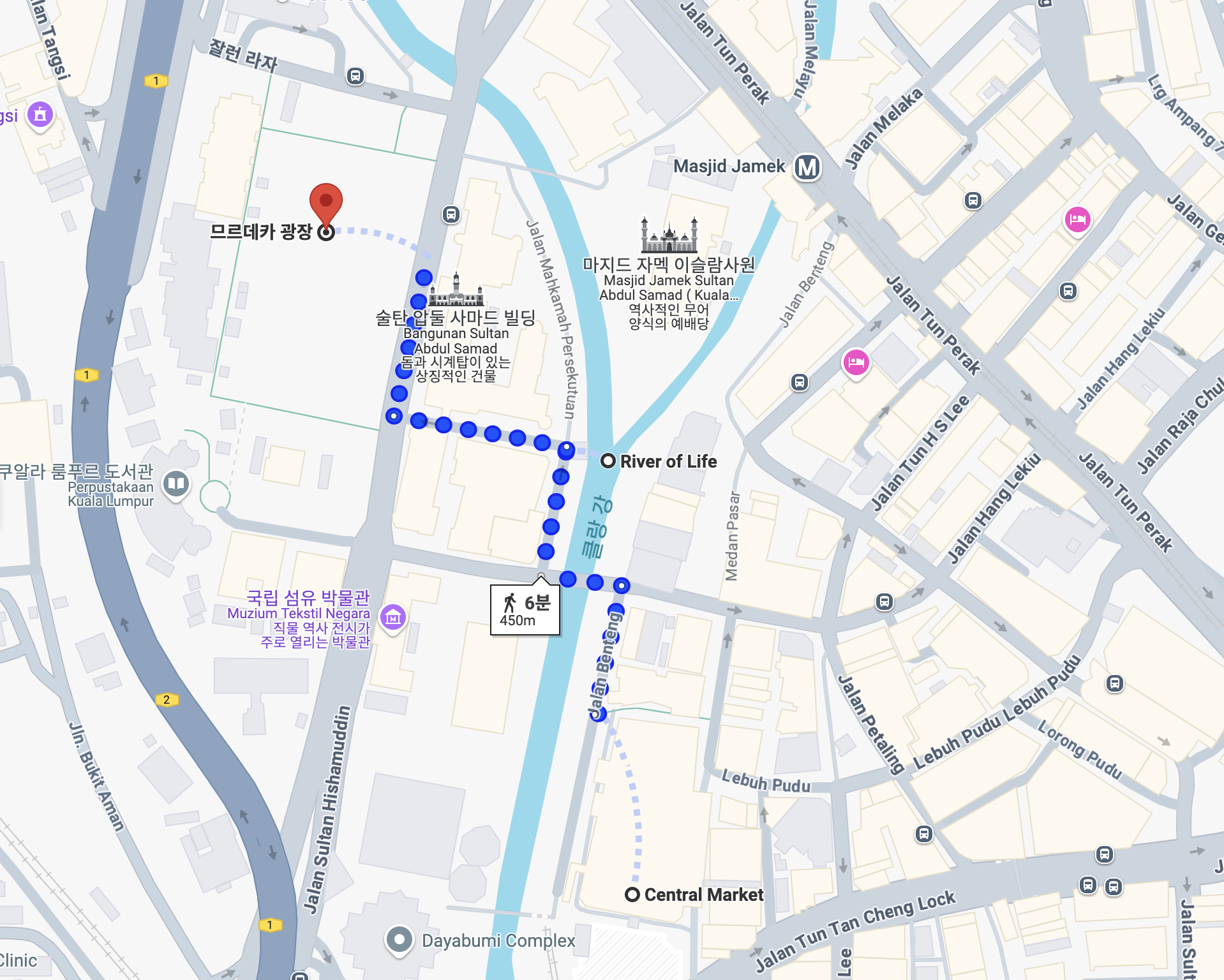 물론 쿠알라룸푸르의 지역명이 왜 쿠알라룸푸르인지 가족들에게 설명을 했지만 한 귀로 듣지도 않고 튕겨버렸기 때문에... 이번 가족여행에서 기억에 남지 않을 가능성이 크다. 쿠알라룸푸르는 '진흙 강이 만나는 곳'이란 뜻을 가지고 있는데 이 2개의 강이 만나는 곳이 바로 므르데카 광장 바로 옆쪽에 위치한 River of life라는 곳이다.