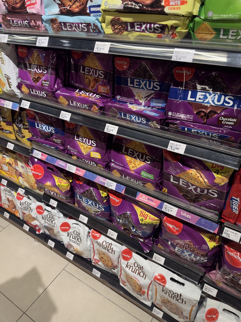 자동차 이름과도 같은 이 렉서스 크래커는 말레이시아 자국 기업인 Munchy's라는 회사가 만드는 크래커 상품이다. 생각보다 이런 크래커, 비스킷 종류가 말레이시아에서 만드는 것이 많고 맛이 좋다. 이 렉서스 크래커도 종류가 굉장히 여러 가지 여서 거의 진열대 한 줄이 렉서스 크래커로 도배가 되어있다.