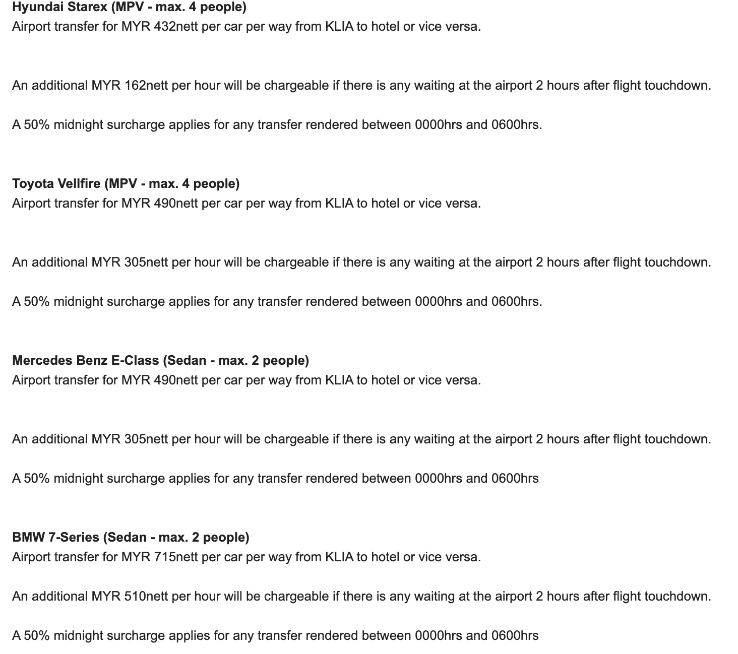 Toyota Vellfire (MPV - max. 4 people) 공항 to 호텔 or 호텔 to 공항 - MYR 490 nett per car 만일 2시간 이상 기다리면 시간당 305 nett 부과 새벽 12:00~06:00까지 50% 할증이 있음