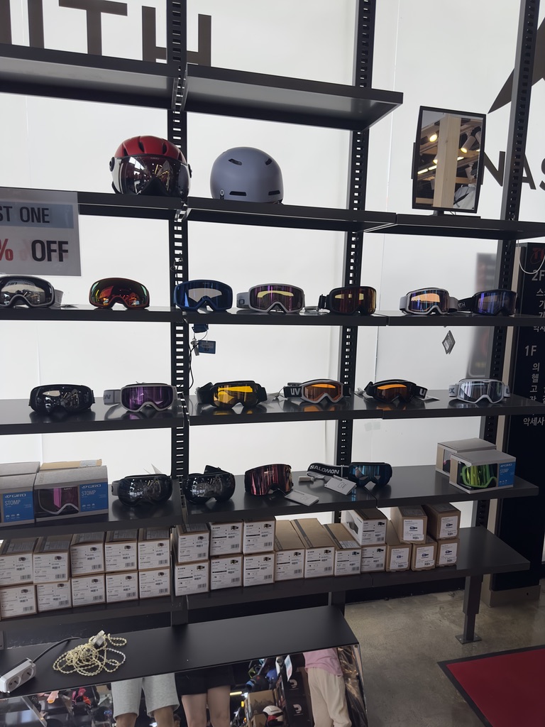 1층에서는 옷과 장갑, 헬멧, 고글등이 구비되어 있는데 우리는 여기서 옷보다는 이너 장갑과 바클라바 정도를 살펴봤다. 옷도 꽤나 싸게 파는듯한데 문제는 원래도 120만 원 하는 옷을 반값에 팔아도 60만 원하기 때문에 가격이 기본적으로 높다. 우리 부부는 비싼 스키복은 저렴한 브랜드에서 사는 편인데 좋은 것을 입어보면 당연히 다른 이너나 내의를 안 입어도 될 정도로 좋지만 60만 원 이상을 옷에 투자하기보다는 차라리 부츠나 플레이트에 투자하는 것이 좋다 생각한다.