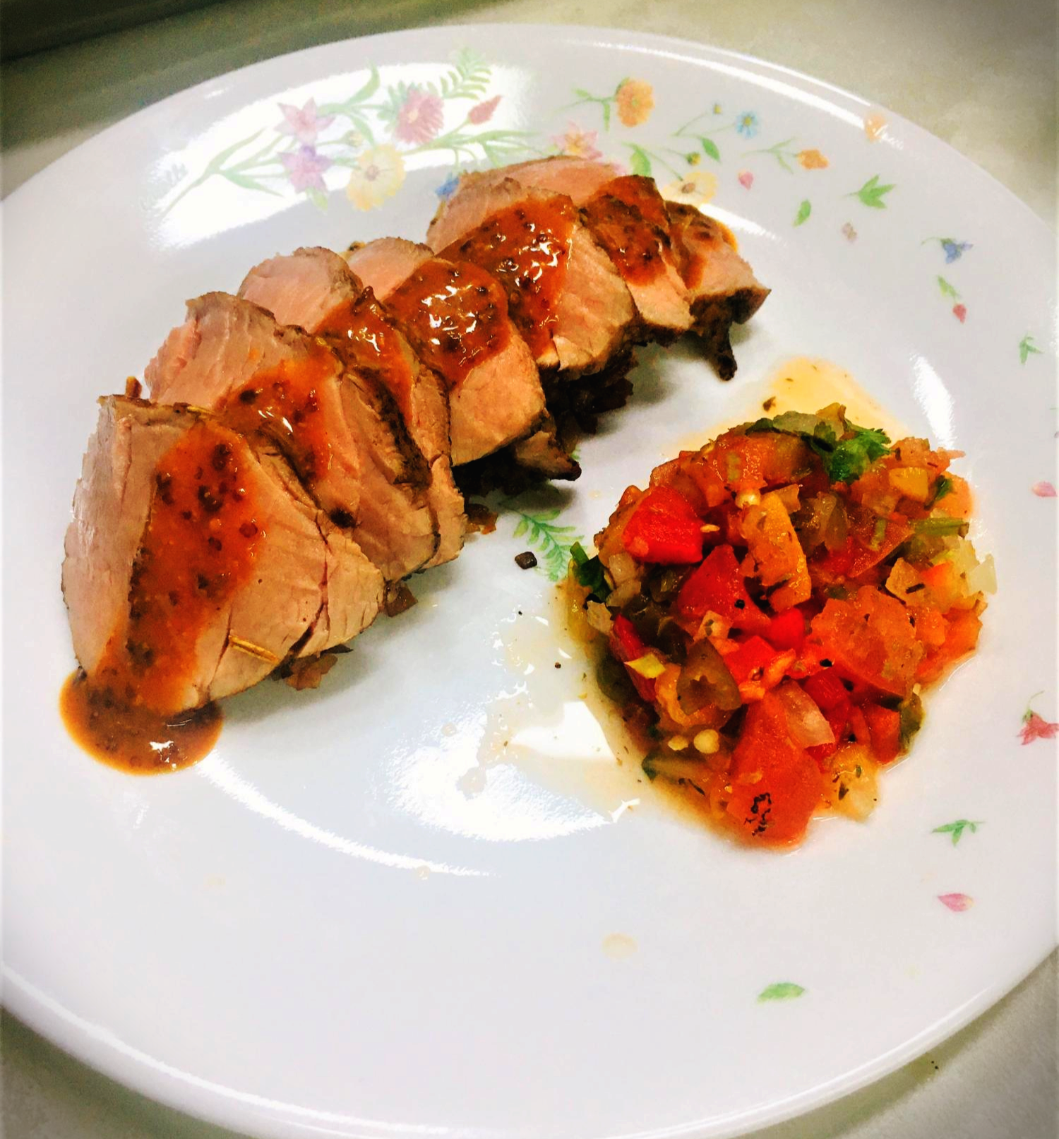 (돼지 안심의 경우 기름기가 거의 없기 때문에 기름을 두르고 천천히 오래 익혀주어야 합니다. (여러 번 뒤집어 주셔야 합니다.) 저 같은 경우에 15분 구운 후 3분 정도 기름을 끼얹어 주었고 5분 레스팅 과정을 거쳤습니다.)