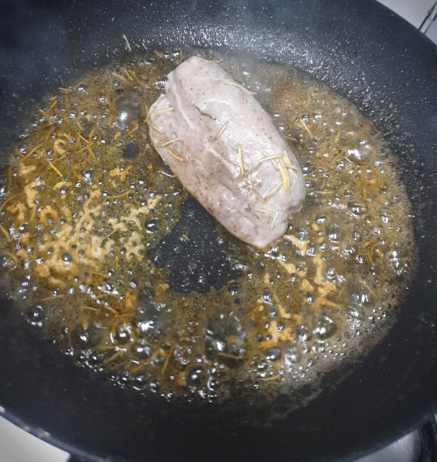 5. 돼지 C는 포도시유를 두른 뜨겁게 달궈진 팬에서 튀기듯 모든 면을 굽고 버터와 로즈마리를 넣고 수비드를 해줍니다. (수비드: 60도에서 40분 ~ 50분)