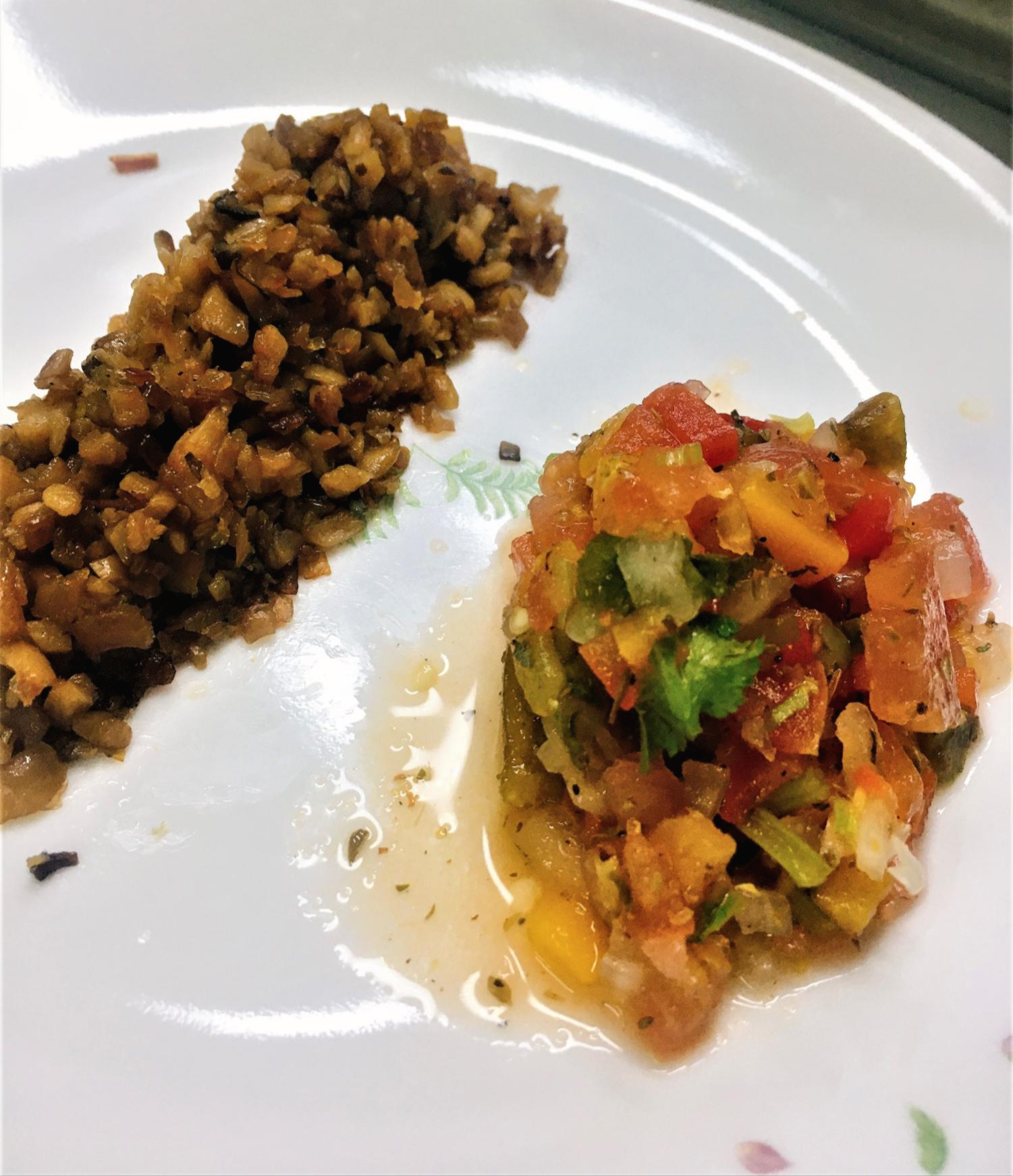뒥셀을 깔고 옆에는 저번에 만들어 놓은 살사를 놓습니다. (살사의 국물이 너무 나옴 ㅋㅋ)