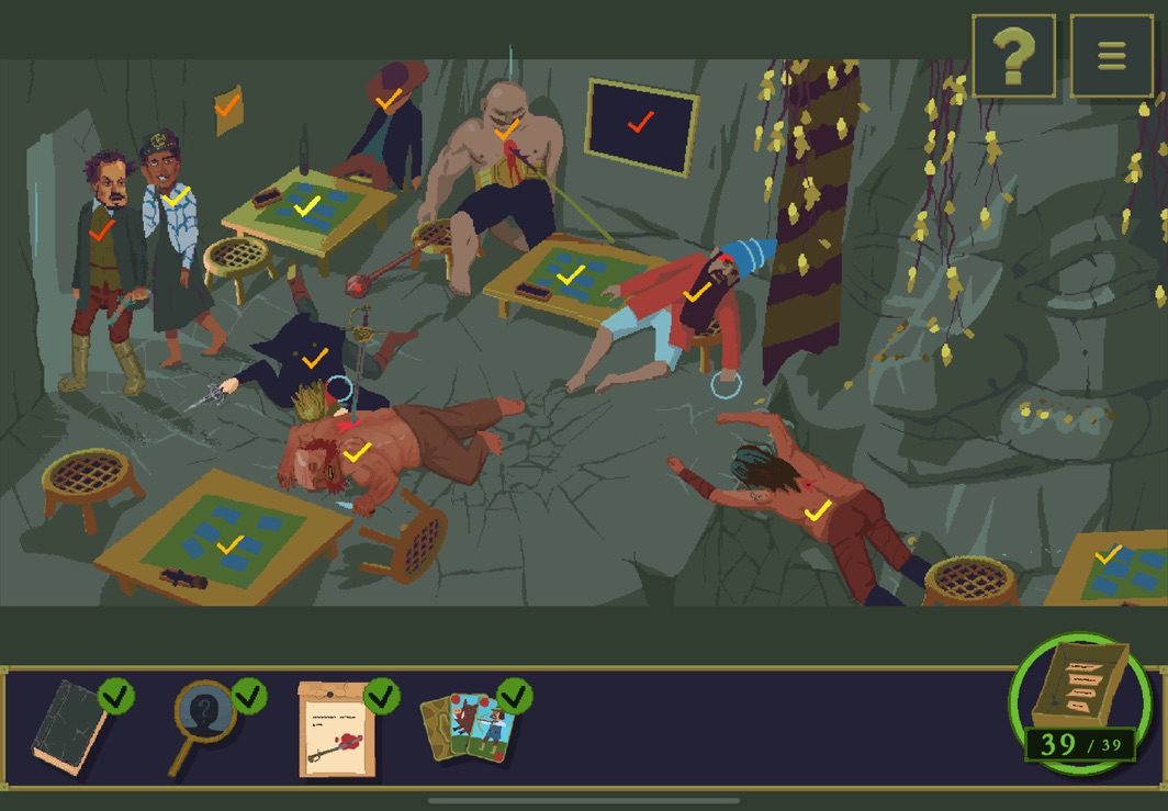 이 문제는 가장 처음과 가장 마지막을 찾으면 그렇게 어렵지 않게 풀린다. 우선 시작은 빌 프라이스가 화가 나서 주비리 케라를 공격하면서 시작이 되었을 것이다. 그러면 빌 프라이스를 누군가 제압하려고 했을 텐데 등에 레이피어를 맞고 죽은 것으로 보아 죽은 사람들 중 무기가 없는 가브리엘 휴버트 일 것이다. 그리고 다음으로 가브리엘을 죽인 건 차크람이기 때문에 스리 타그손이 차크람을 날려 죽였고 바로 앞에 있던 판둘라 세네비가 곤봉으로 머리를 쳐 스리 타그손을 죽였다.