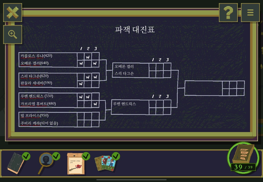 이 정보를 가지고 우선 대진표를 가보면 첫 번째 게임인 카를로스 루나 Vs. 오베론 켈러의 경기였다는 것을 알 수 있다. 가장 왼쪽 위에 위치한 게임은 노란색이 먼저 2번 이겼고 파란색이 마지막을 이겼기 때문에 3번째 경기인 루벤 헨드릭스와 가브리엔 휴버트라는 것을 알 수 있다. 그리고 그 오른쪽 가운데에 있는 게임의 경우에는 노란색이 우선 한판 이겼지만 나머지는 모두 파란색이 이겼기 때문에 2번째 경기인 스리 타그손과 판돌라 세네비의 경기였다는 것을 알 수 있다.