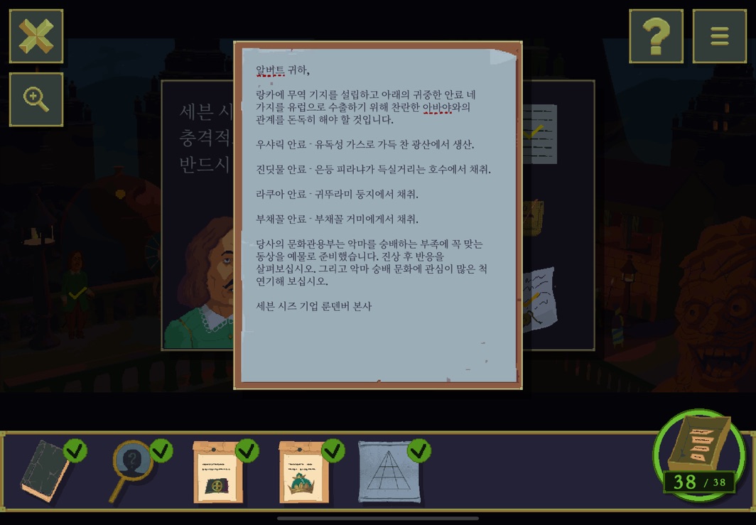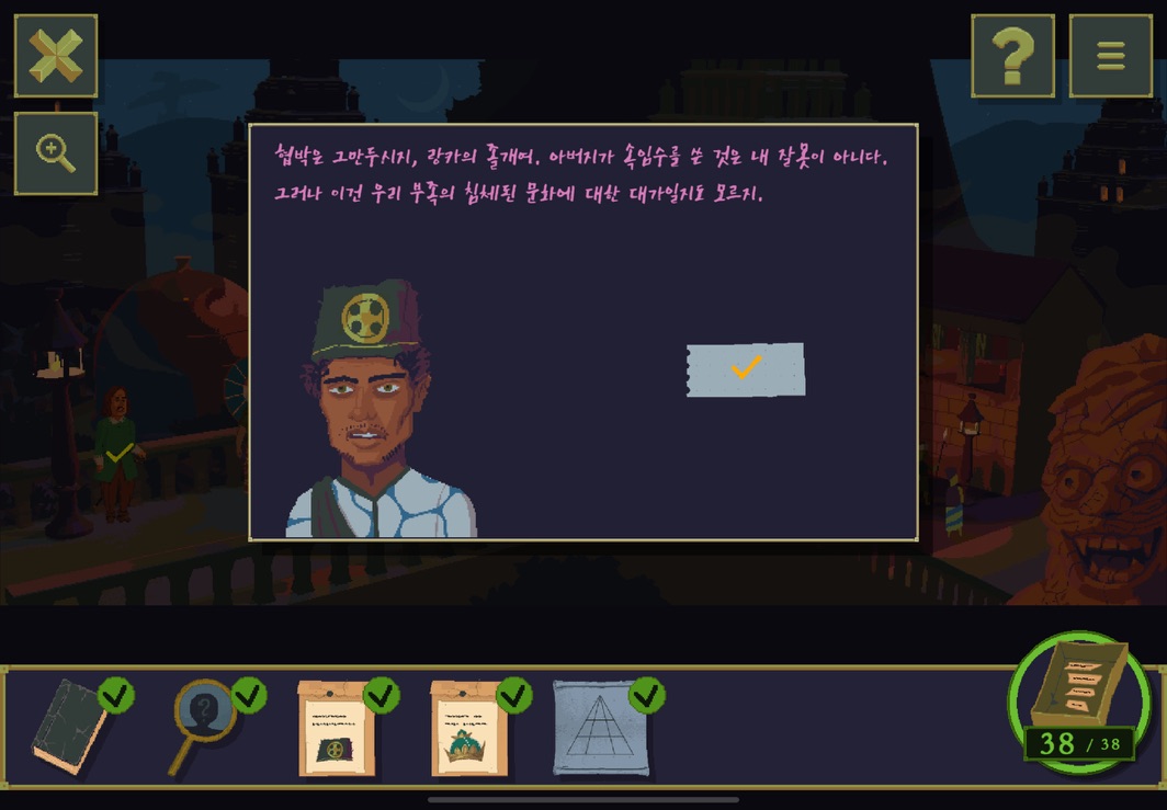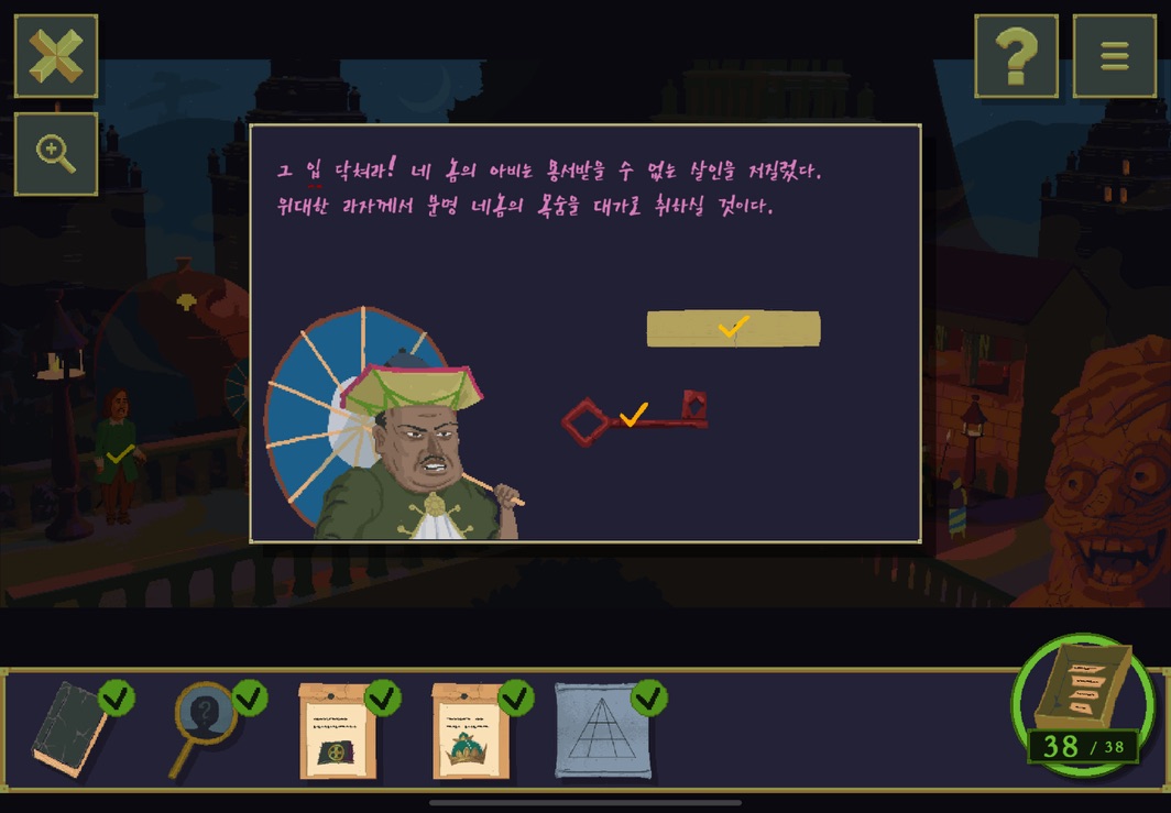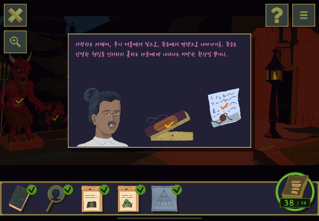 그래도 처음 에피소드에선 풀리지 않는 요소는 거의 없었다고 할 수 있다. 하지만 두번째 부터는 좀 정도가 심해지긴 하는데 이 추측성 정답이 조금 얼토당토않은 경우가 있다. 정답을 맞춰놓고도... 이게 왜? 라는 의문이 남는다고나 할까? 그래도 이제부터는 황금 우상에 대한 스토리가 조금씩 흘러나오긴한다. 스토리를 위투로 보면 좋을듯?