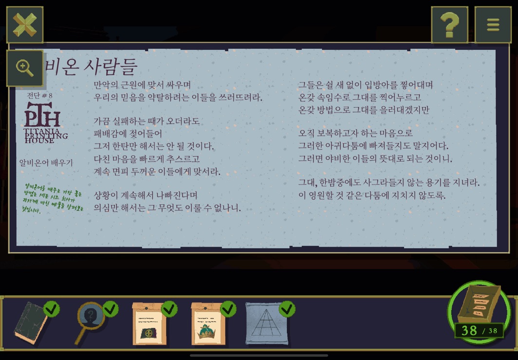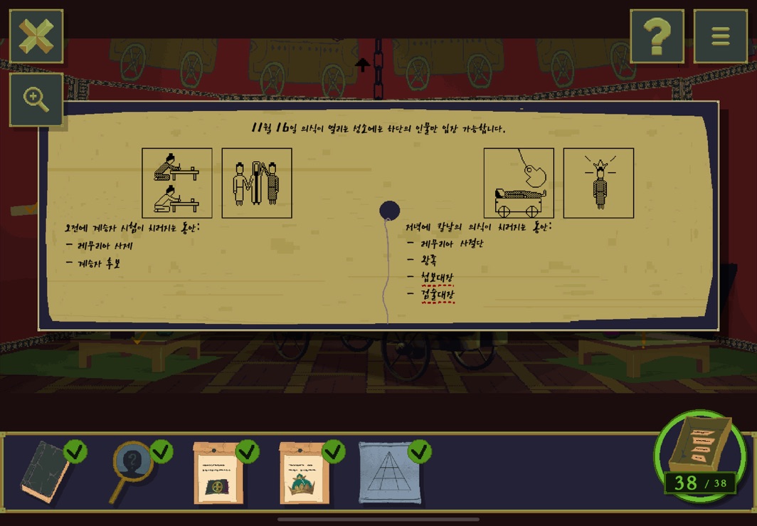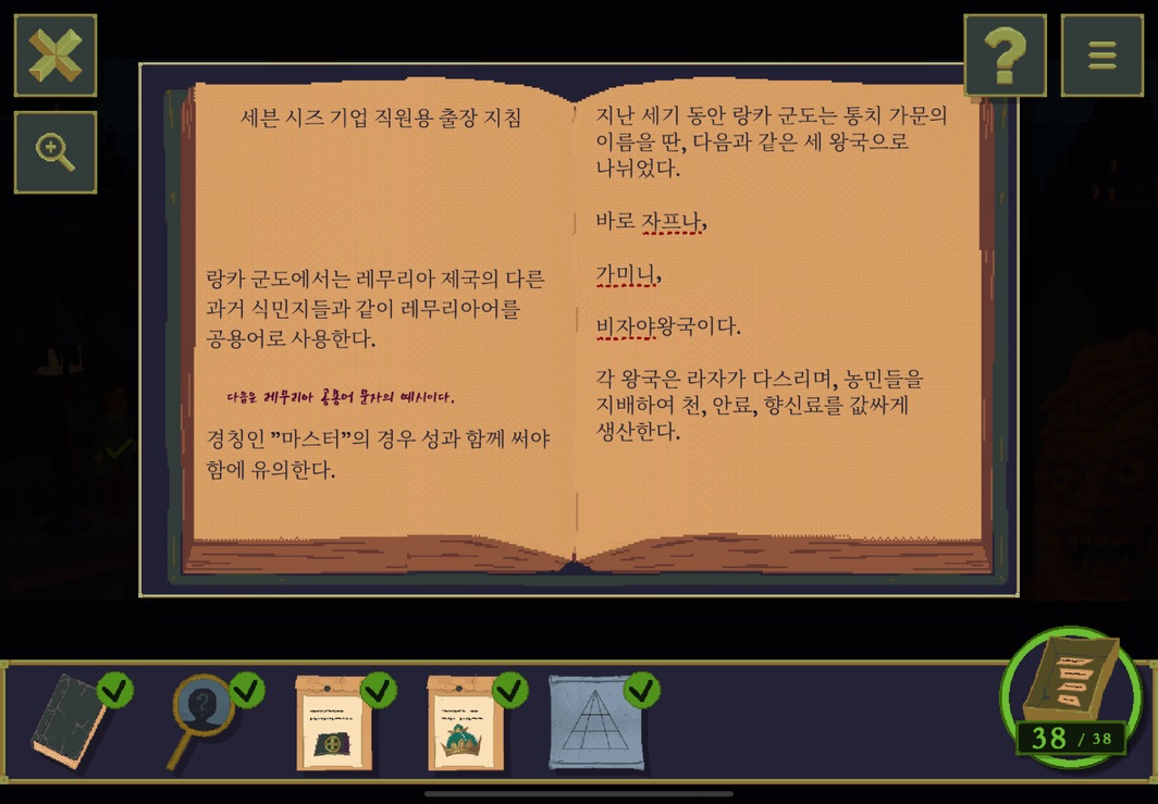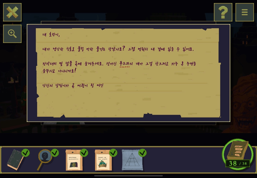 우선 공략이긴 하지만 태블릿, PC, 모바일마다 다르기도 하고 거기에 버전이 몇이냐에 따라서 또 뷰와 약간의 워딩이 다르기 때문에 공략을 볼 때 완전히 똑같지 않더라고 일단 뜻을 알고 가면 도움이 된다. 그리고 너무 많은 힌트 이용은 게임의 재미를 떨어뜨리니 조심하시길.