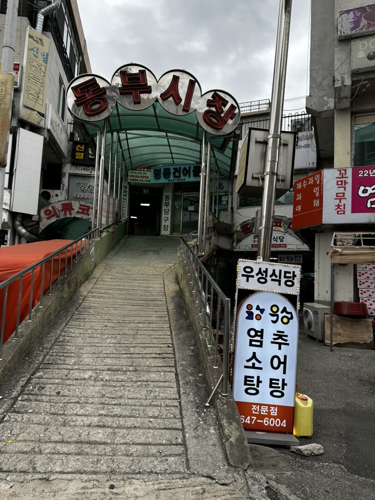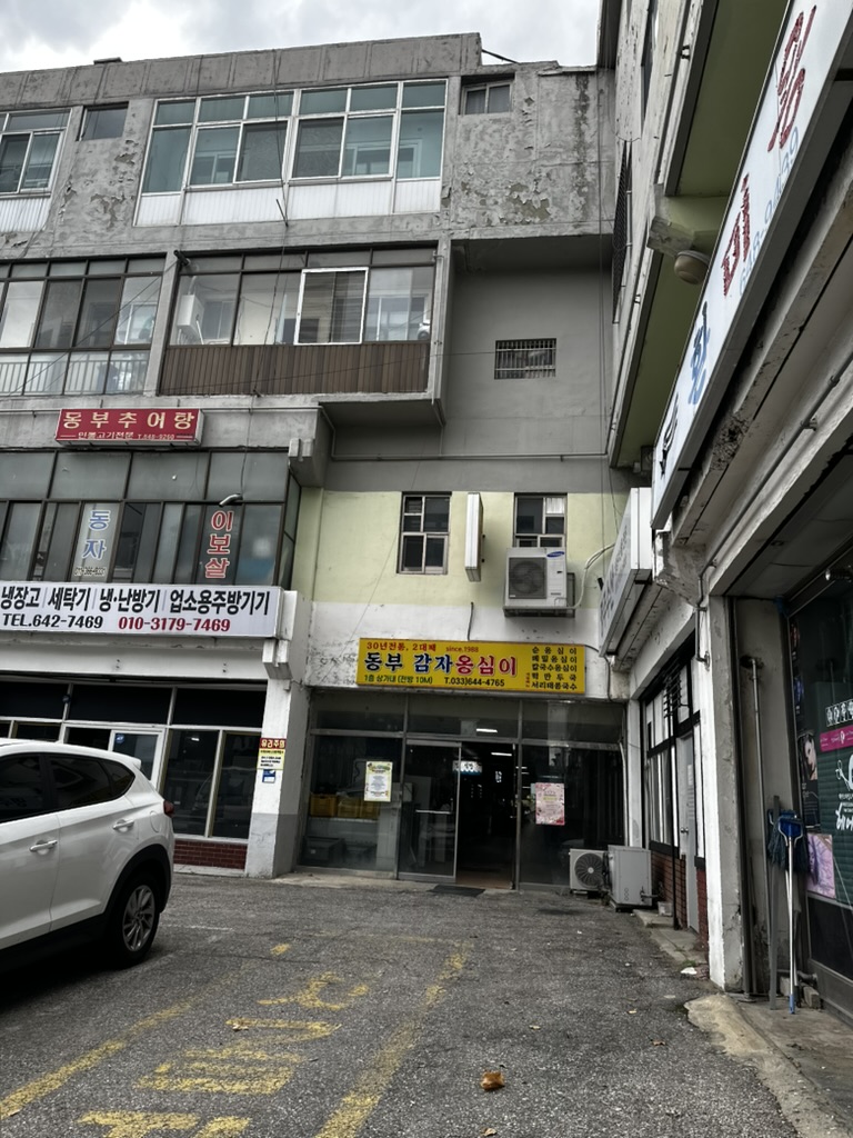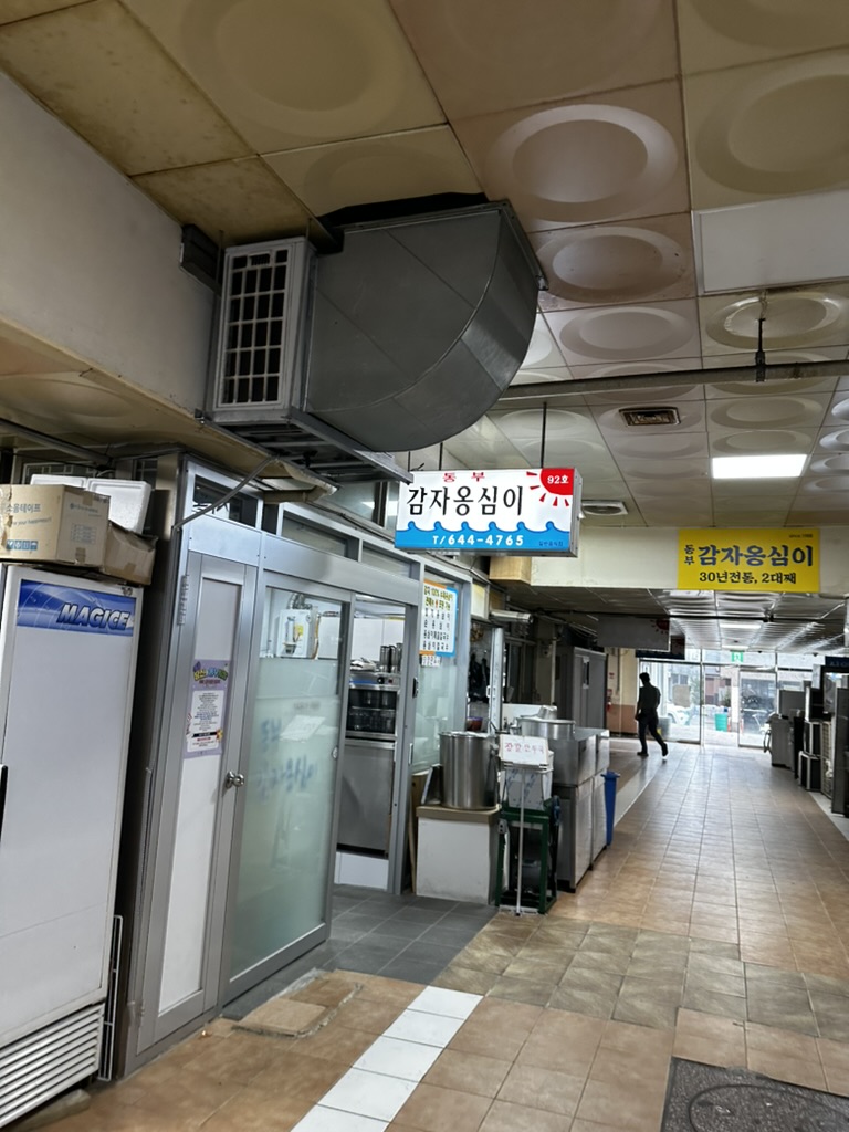 강릉역과 가까운 동부시장 안에 위치하고 있는 동부 감자 옹심이집은 동부시장 입구에서 위가 아닌 아래로 가야 있다. 이 시장이 중앙시장보다는 작고 건물 안에 들어가 있어서 사람들이 자주 찾지는 않는 것 같은데 그래도 꽤 음식 맛집은 있는 것 같다. 사실 외부에서 보기에는 마치 옛날 구룡성채(?)를 보는 것 같은 느낌이 들긴 하지만 안으로 들어가 보면 그냥 별 다를 것 없는 시장이다.