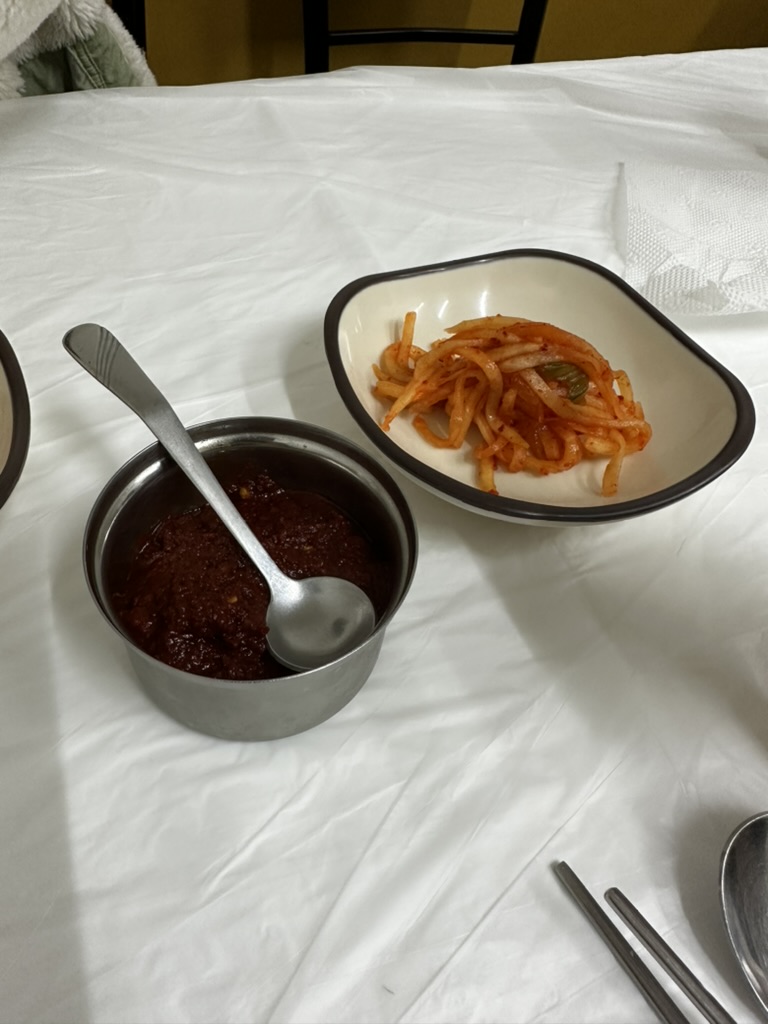 주문을 하면 김치와 무생채가 나온다. 김치와 무생채가 정말 젓갈이 강하게 들어가 맛이 강한 음식이다. 이게 전라도 김치라기보다는 강원도 김치의 특징인 것 같은 김치로 간이 센데 단맛이 많이 적은 김치라고 할 수 있다. 무생채는 푹 익어 김치 속 같은 느낌을 내며 신 맛이 강하다. 무채보다는 김치가 요물인데 특히 옹심이에 같이 먹으면 그 조화가 정말 좋다.