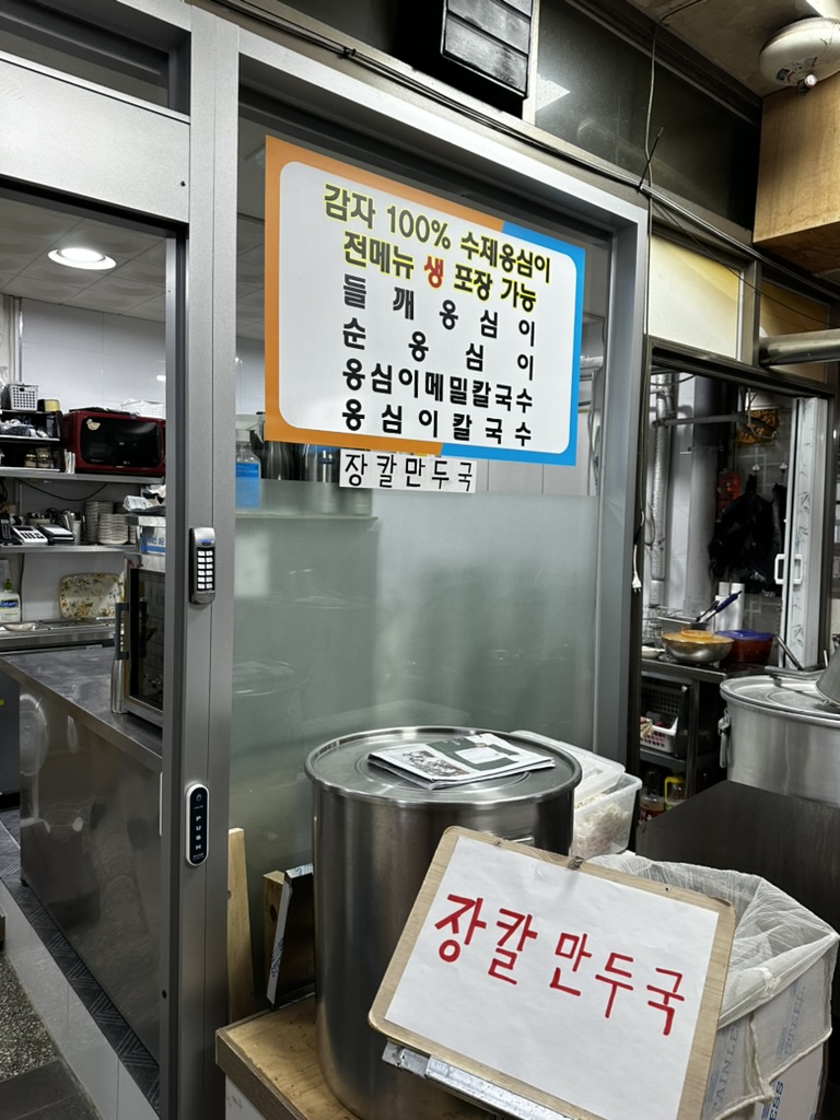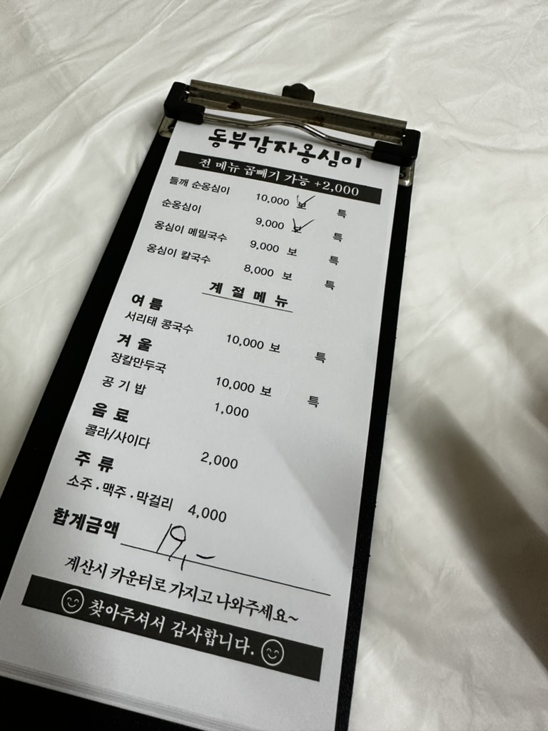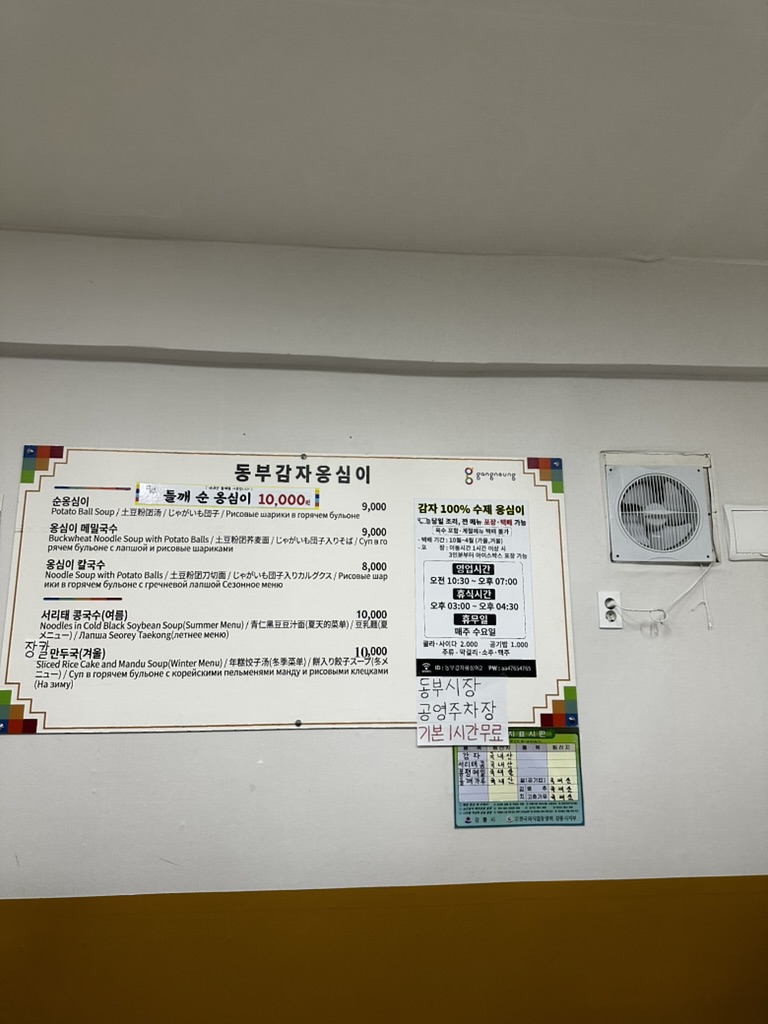 우리는 다른 것 없이 순옹심이와 들깨옹심이를 시켰는데 이것 이외에 만둣국을 제외하고는 다른 음식이 있지는 않다. 여름에만 콩국수를 할 뿐 다른 메뉴가 없기 때문에 초이스가 없다고 할 수 있다. 그리고 이곳은 주문 시 동부시장 공영주차장이 1시간 기본 무료이라 이용할 수 있다. 주변에 주차장이 꽤 많은데 유료 주차장도 꽤나 섞여있기 때문에 조심해서 주차를 해야 한다.