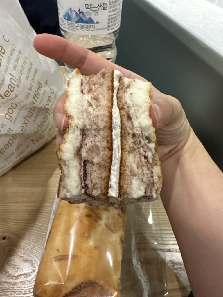 반원모양으로 생긴 게 모카빵인데 조금 신기한 느낌이다. 폭신폭신한 카스텔라 갔지만 또 안쪽은 당근케이크같이 당근이 들어있고 빵 중간중간에는 딸기잼이 발려져 있다. 그리고 밖에 둘러싼 부분에서만 모카향이 나고 크림도 발려져 있다. 먹으면 약간 목이 막힐 정도의 빡빡함이라 우유나 커피와 먹으면 좋다.