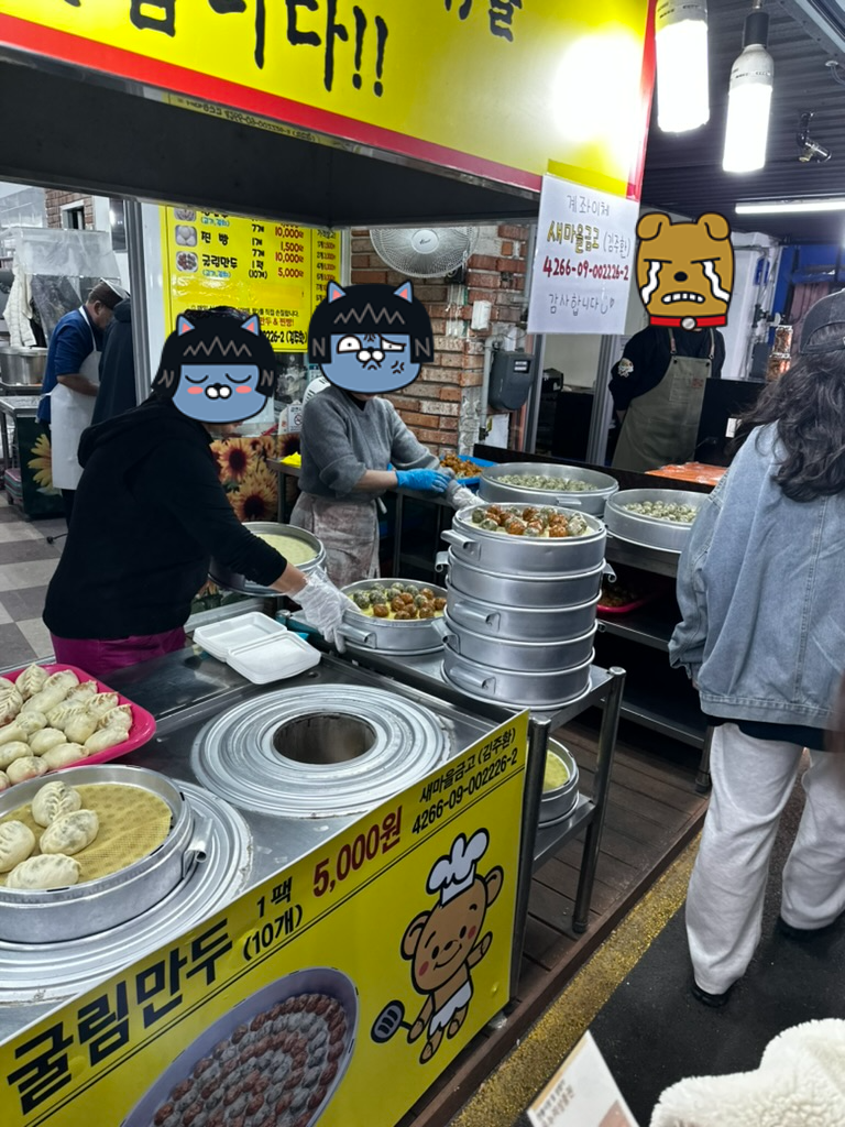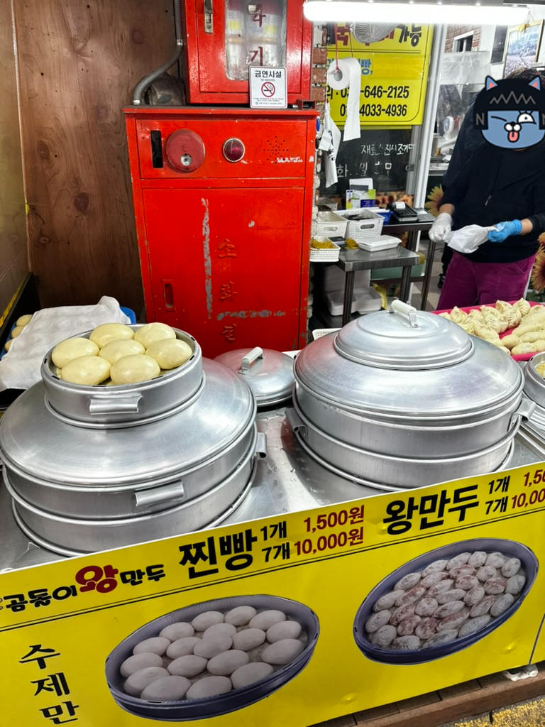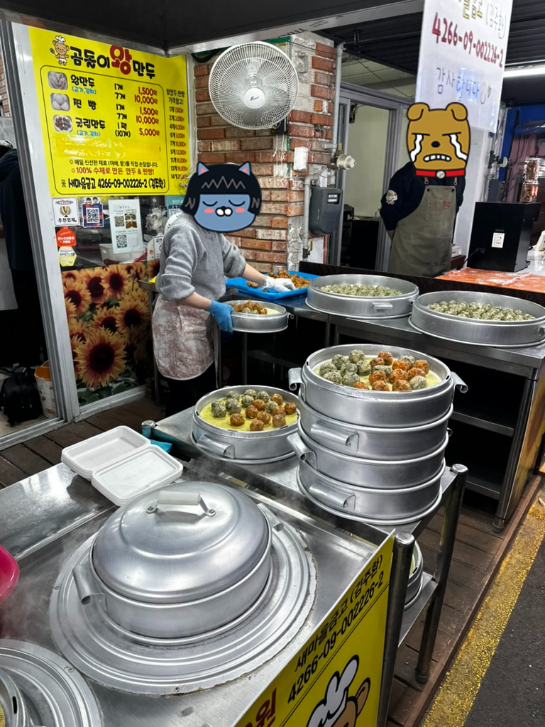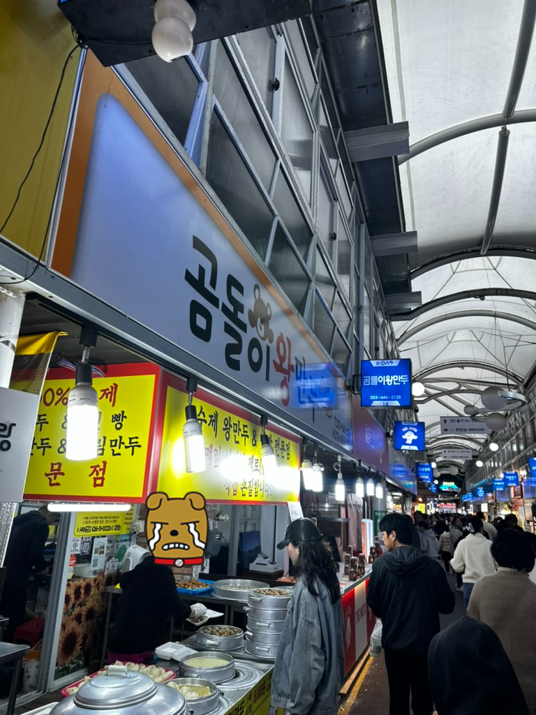 강릉에서 가장 관광객이 몰리는 시장인 중앙시장의 초입에 위치하고 있는 곰돌이 왕만두는 멀리서부터 만두를 찌는 냄새가 난다. 이 만두집은 만두와 찐빵만 팔고 있다. 우리가 갔을 때는 다른 유명한 집과는 다르게 줄이 서있지 않았는데 그래도 계속해서 만두를 사가는 사람들이 끊임없이 있었다.