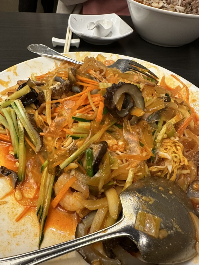 중식을 몇 개 안 시키고 이렇게 배불렀던 건 정말 오랜만인 것 같다. 튀김을 시키지 않아서 조금 아쉬우긴 했지만 다음번에 가게 된다면 튀김류도 시켜서 먹을 것 같다. 이 중식당의 경우에는 옛날 스타일과 요즘 스타일이 좀 짬뽕이 된 것 같은 느낌이 들긴 했다. 간짜장에 올라간 계란과 단맛, 불맛은 옛날 스타일이지만 양장피의 넙적 당면은 오히려 간편함을 쫒은 요즘이었고 또 마지막에 디저트로 나온 옥수수 빠스는 옛날 스타일이고 차돌 짬뽕의 과함은 요즘 스타일인 것 같았다.