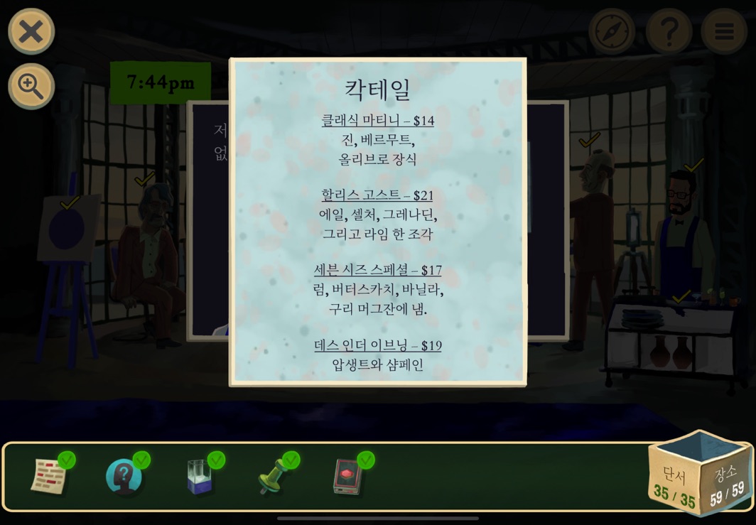 칵테일 바에서 일하는 '로비 프로버그'는 앞치마를 벗어던지고 어딘가로 가버린 모양이다. 그리고 칵테일을 구매한 것을 보면 '투생'교수는 에시 인 더 이브닝 한잔, '다실바' 여사는 마티니 한잔, '네바리'여사는 SSS 3잔이나 주문을 한 것으로 보인다.