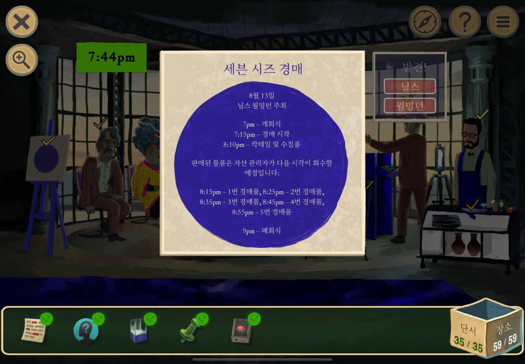 경매장 1층에서는 7명의 인물이 있다. 이 인물들이 각각 다음 시간대에서 어떤 위치에 있고 어떤 일을 벌이는지를 잘 찾아내야 한다. 물론 2층에도 한 명이 있기 때문에 총 8명의 인물의 움직임을 잘 살펴봐야 한다.