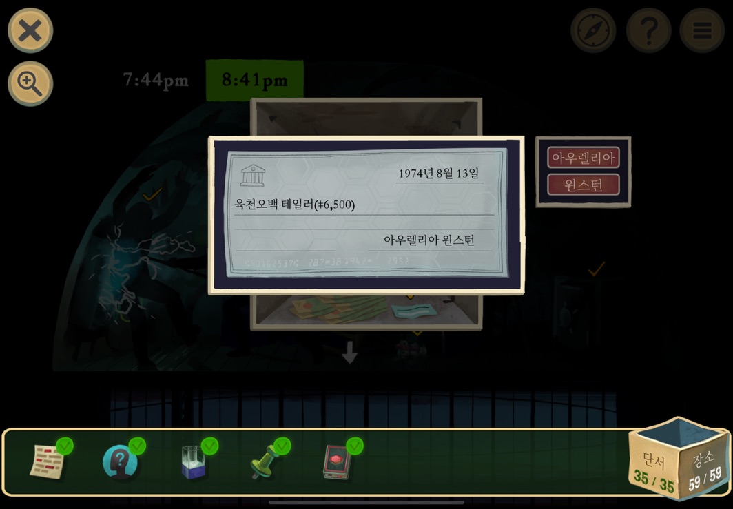 금고에는 현금 7,350달러로 S-3, '서머 나이틀리'가 구매한 2가 물품에 대한 대금이 들어있고 A-4인 '아우렐리아 윈스턴'이 지불한 수표가 들어있다. 이를 통해 수표를 가지고 있는 여자는 '아우렐리아 윈스턴'이라는 것을 알 수 있다.
