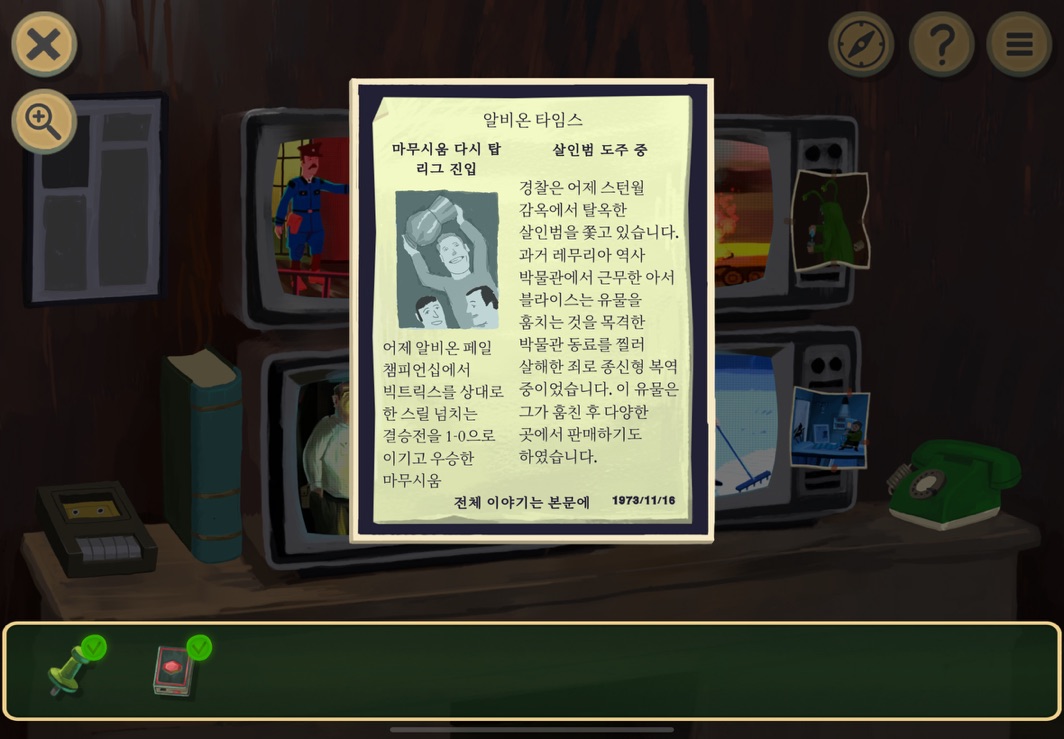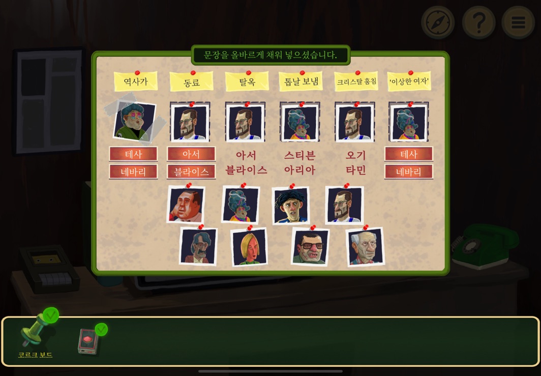 이번 쳅터 퍼즐의 문제는 바로 사람들의 이름과 행방이다. 계속해서 같은 등장인물이 나오지만 이름을 모른다던지 혹은 다른 이름을 쓰고 있어서 이걸 알아맞히는 것이 이번 쳅터의 퍼즐의 주된 내용이다. 생각보다 쉽진 않다.