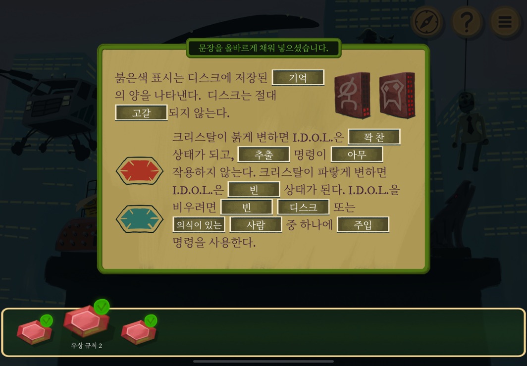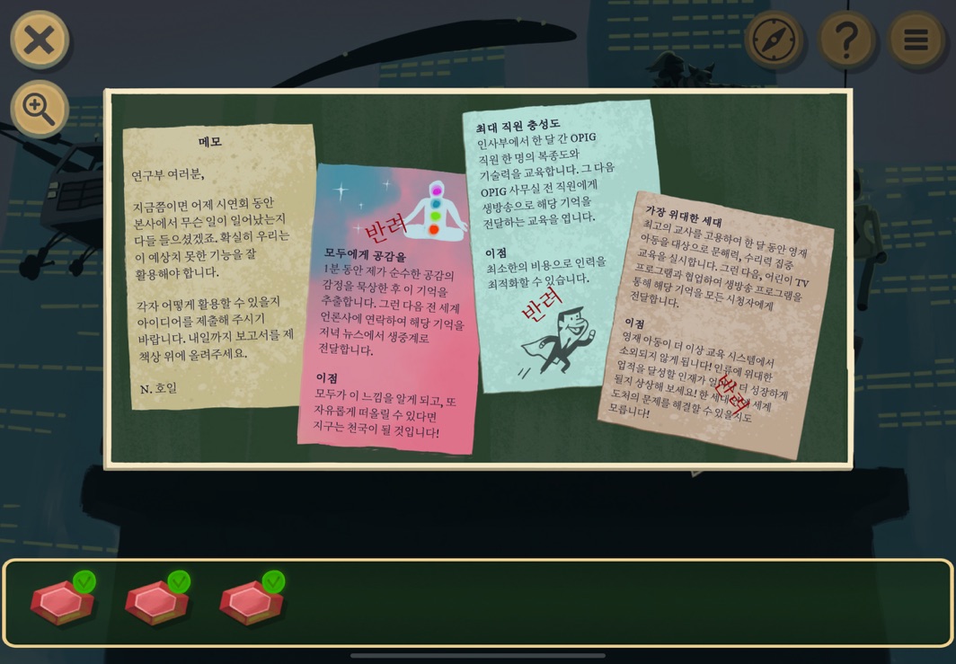 우선 공략이긴 하지만 태블릿, PC, 모바일마다 다르기도 하고 거기에 버전이 몇이냐에 따라서 또 뷰와 약간의 워딩이 다르기 때문에 공략을 볼 때 완전히 똑같지 않더라고 일단 뜻을 알고 가면 도움이 된다. 그리고 너무 많은 힌트 이용은 게임의 재미를 떨어뜨리니 조심하시길.